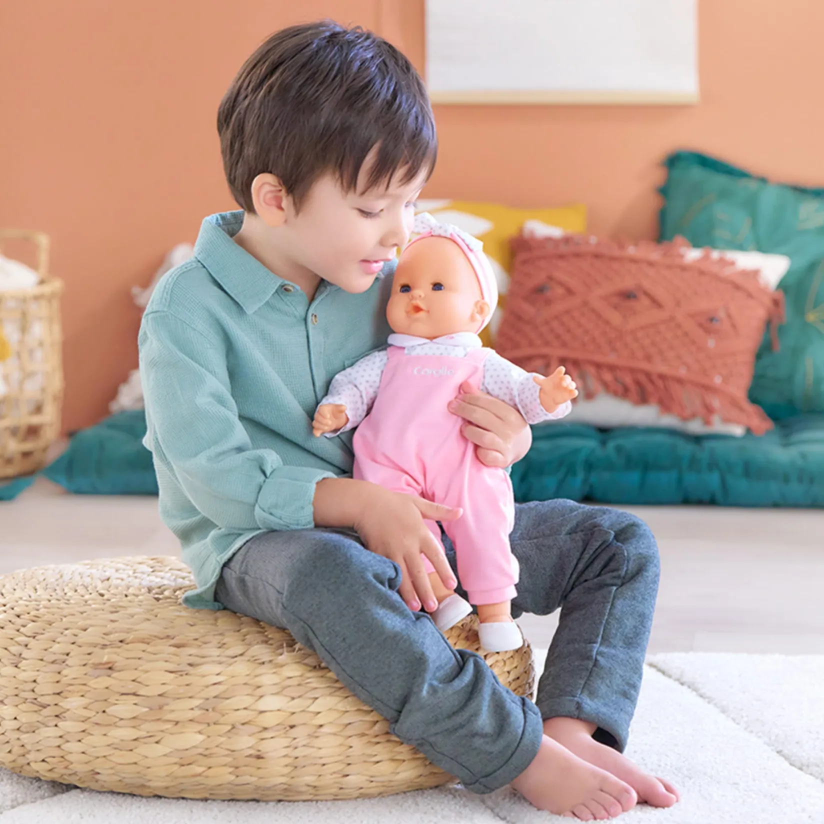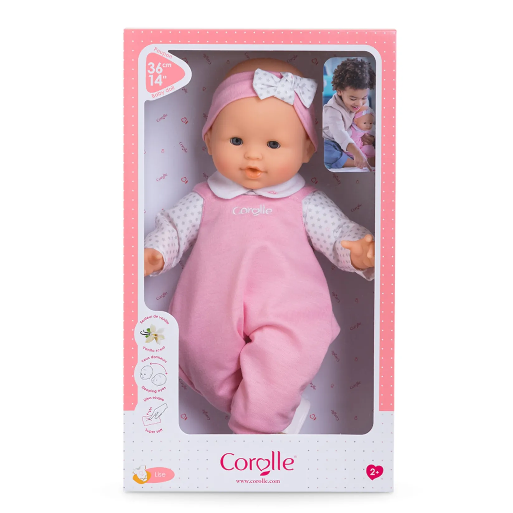 She measures 36 cm, a size perfectly suited to a child’s little arms for cuddling, mothering and reproducing the gestures that make you grow up. Lise has all the attributes of a Corolle doll: her face, arms and legs are made of soft-touch vinyl with a delicate, comforting vanilla scent. Her body is flexible for easy movement and she sits upright. Her thumb can be held in her mouth. This big doll has white skin and blue eyes. She also has sleeping eyes: she sleeps when you lay her on her back! Lise is dressed in pretty pink overalls and a long-sleeved white polo shirt, with a star pattern and a claudine collar. To complete her outfit, Lise wears a pink headband with a matching starry bow and a pair of white ballet flats.Â