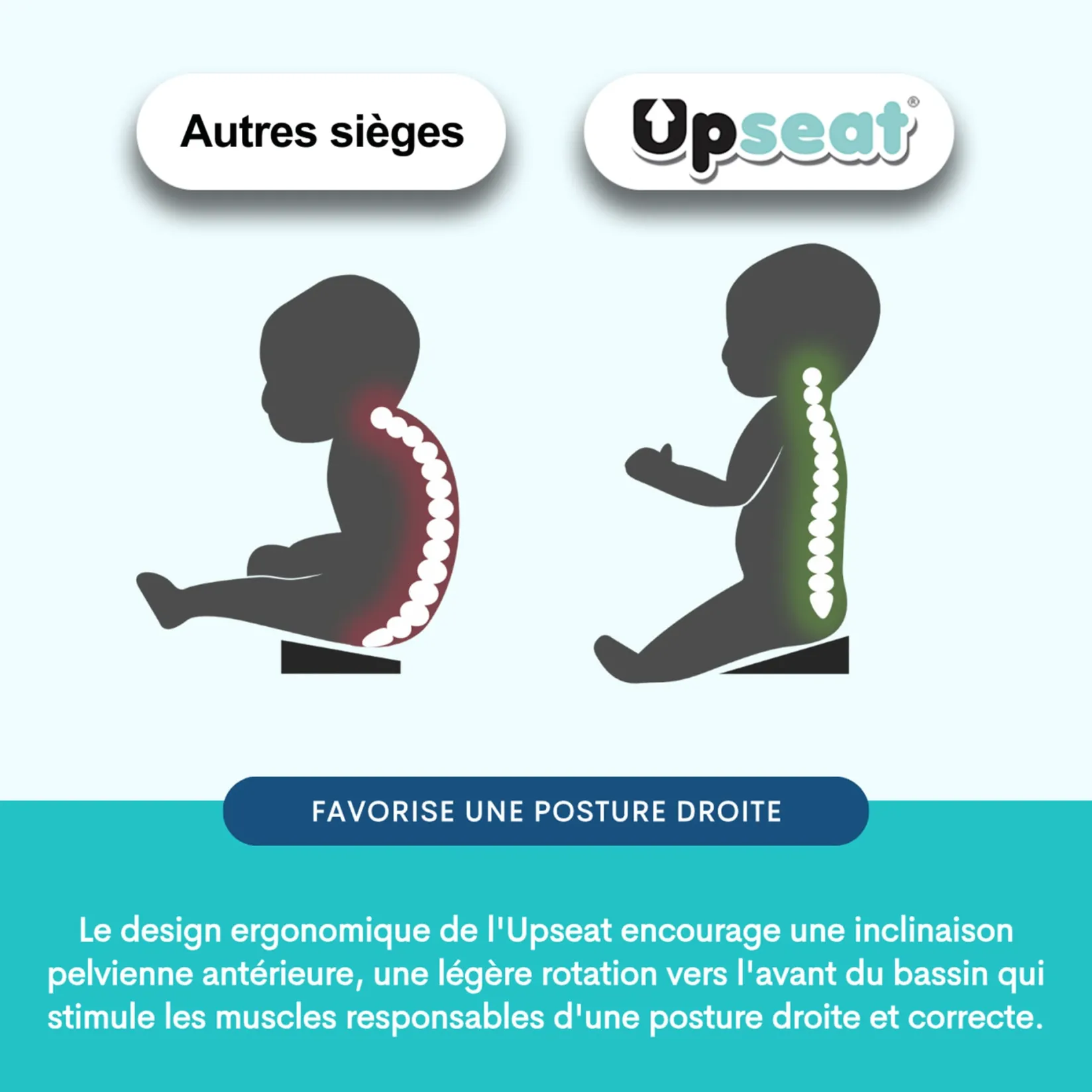 The Upseat was developed with the help of physiotherapists. Its ergonomic design promotes anterior pelvic tilt: a slight forward rotation of the pelvis that engages the muscles responsible for a proper upright posture. The Upseat is also designed to gently spread baby’s legs, encouraging healthy hip development.