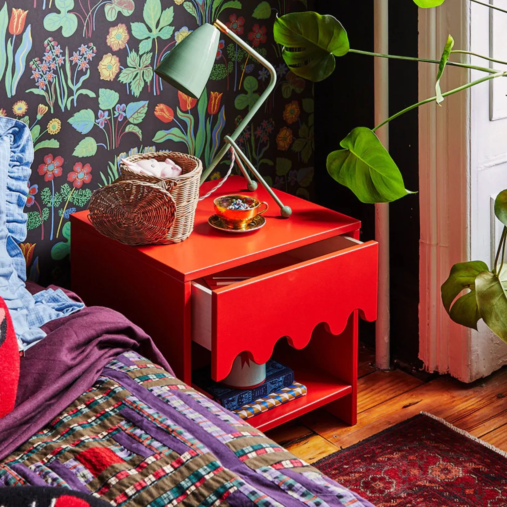 The Oeuf Moss Nightstand features a bold-yet-simple wave motif that’s an instant statement in any room, whether minimalist or maximalist. It smartly provides both open and closed storage, including a drawer to contain clutter