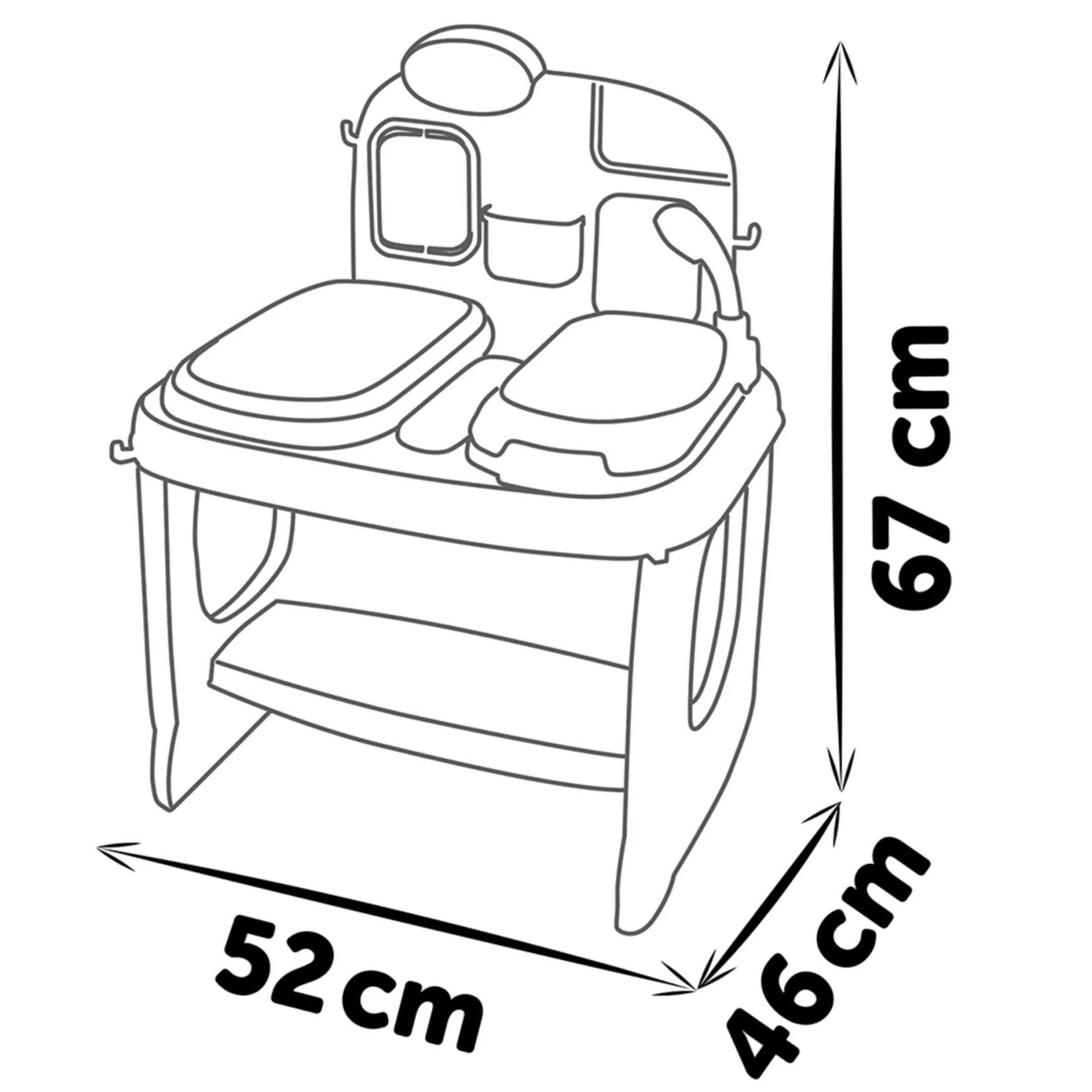 It is composed of various spaces and play functions: examination table, rotating screen, storage bins, bathtub with adjustable temperature and handheld showerhead, first aid box with tilting drawer, storage shelf under the product, coat hooks.