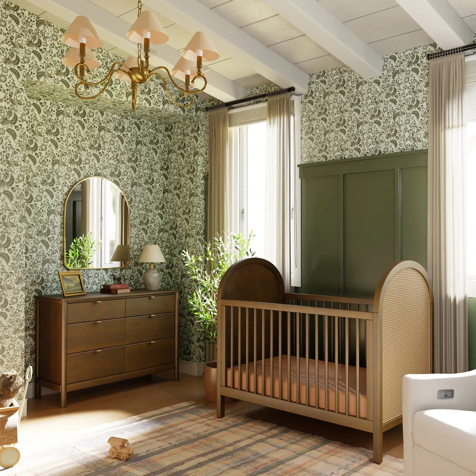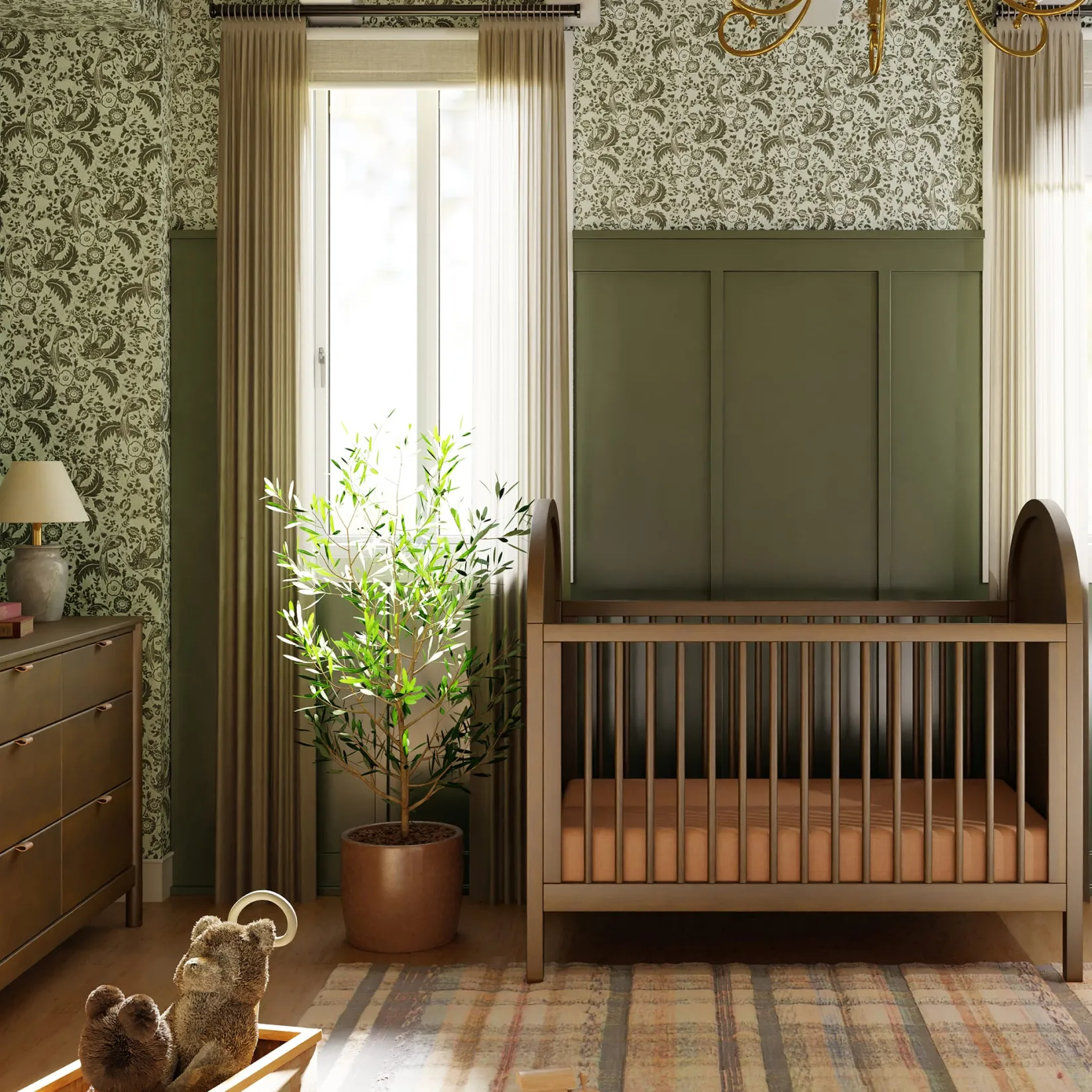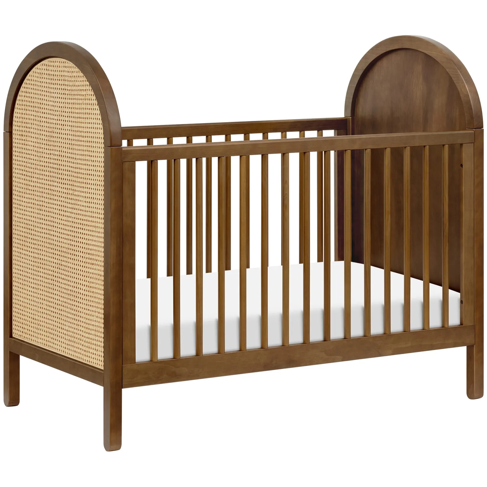 The Bondi Cane 3-in-1 Convertible Crib celebrates boho-inspired design and natural materials with its warm wood tone, playfully arched side panels, curved feet, and woven plant-based cane. The Bondi is designed to grow with your babe using an included toddler bed conversion rail and is screened for harmful chemical emissions to ensure it meets GREENGUARD GOLD Certification.