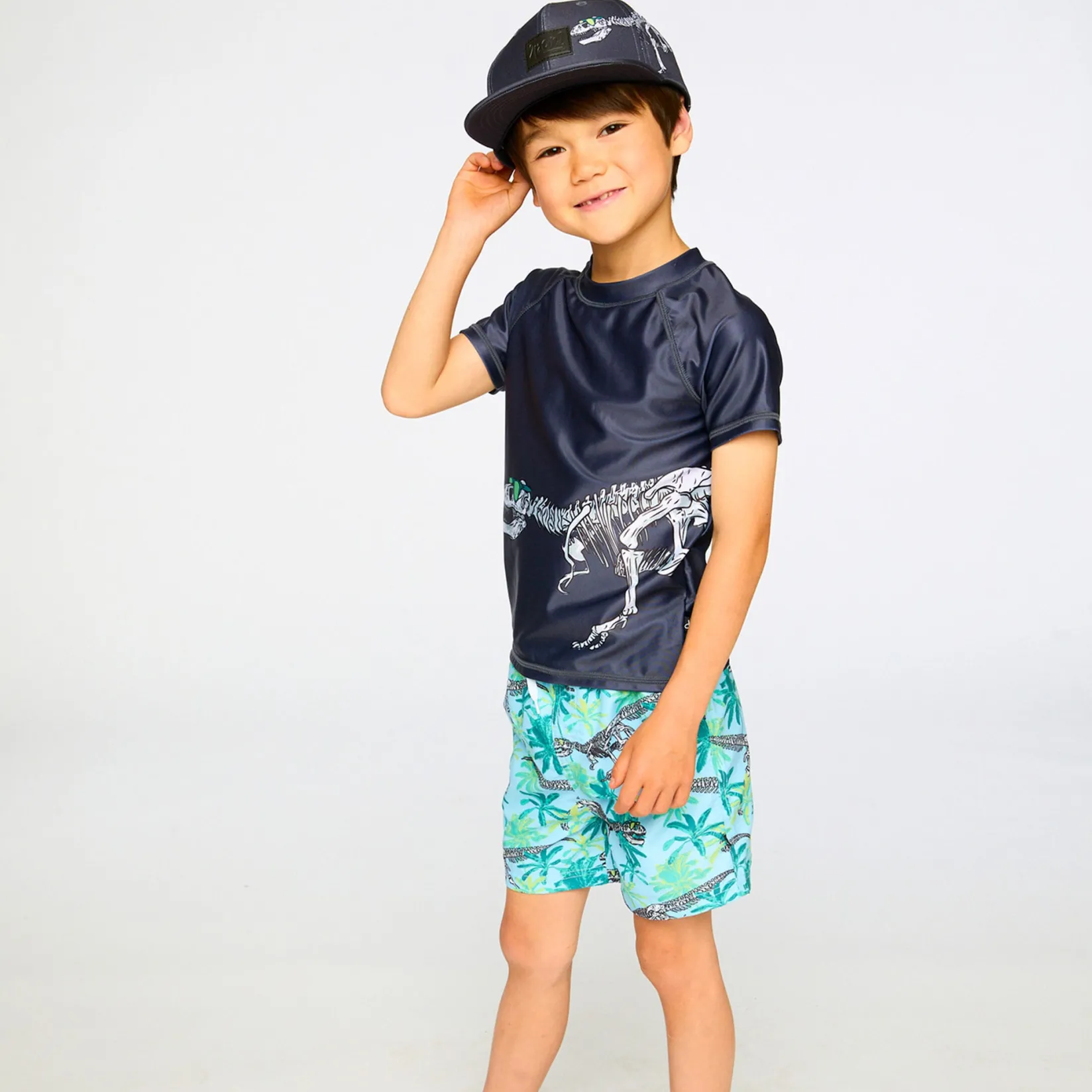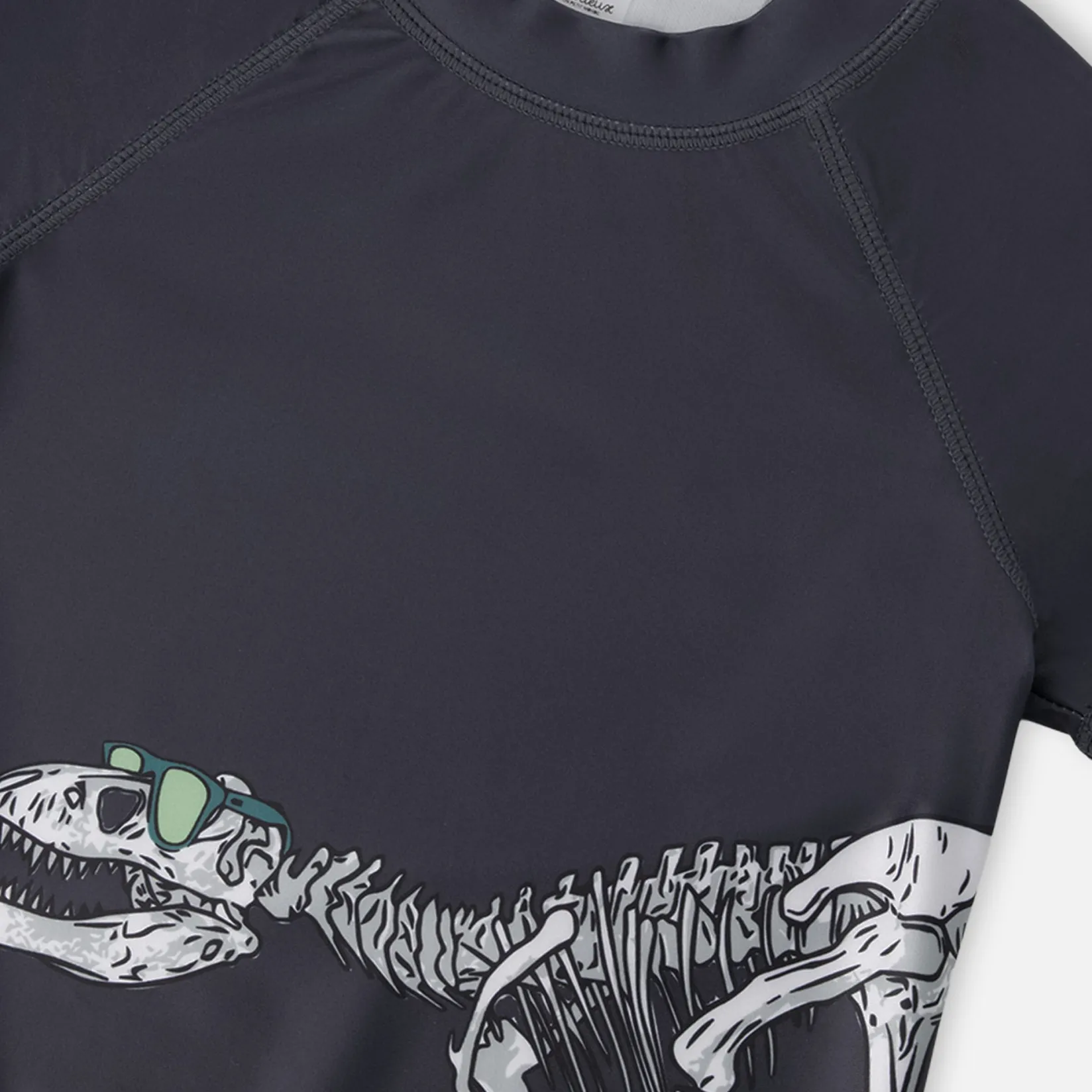 This short sleeve rashguard in black combines cool style with sun-ready protection. This swim top features short contrast sleeves and a bold front print of a dinosaur skeleton wearing sunglasses, crafted from recycled polyester with stretch for comfort and easy movement. Quick-drying and lightweight, it keeps boys comfortable during long days of water play.