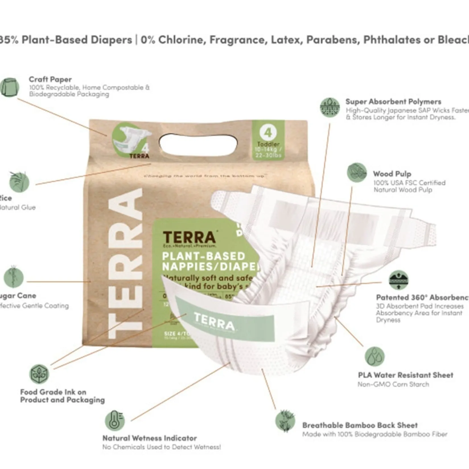 When your little one enters the world, Terra 85% Plant-Based Diapers are right there to protect their soft delicate skin from day one.
