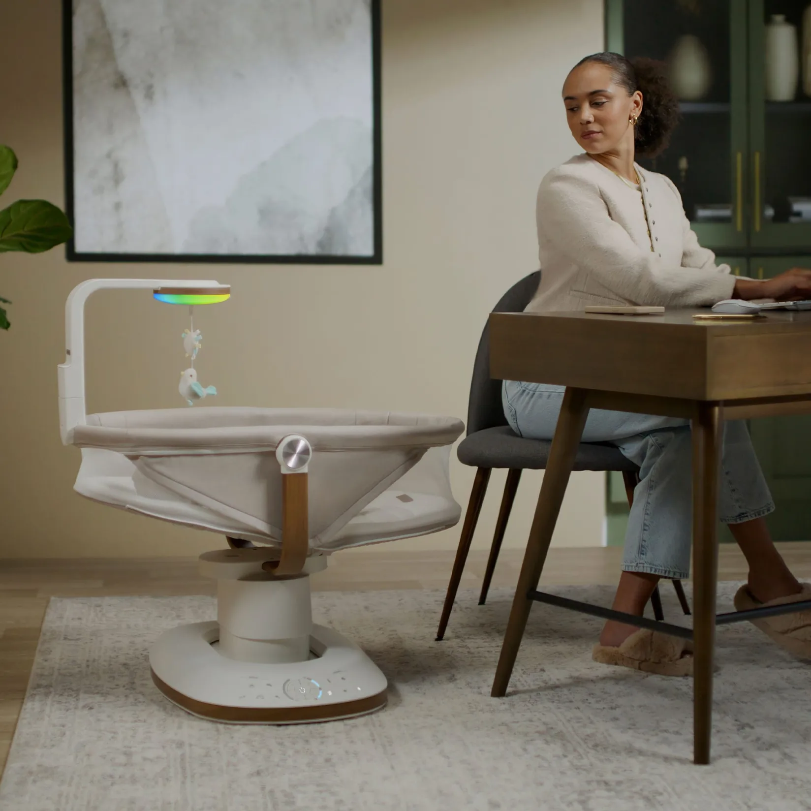Customize your baby’s experience with 10 different motions, 5 adjustable speeds, and 90° rotation capability that lets you fine-tune seating position and swing movements for optimal engagement and soothing. The sophisticated design features breathable air mesh, machine washable fabrics and elegant wood-like accents that create an elevated, stylish aesthetic seamlessly blending with any home décor.