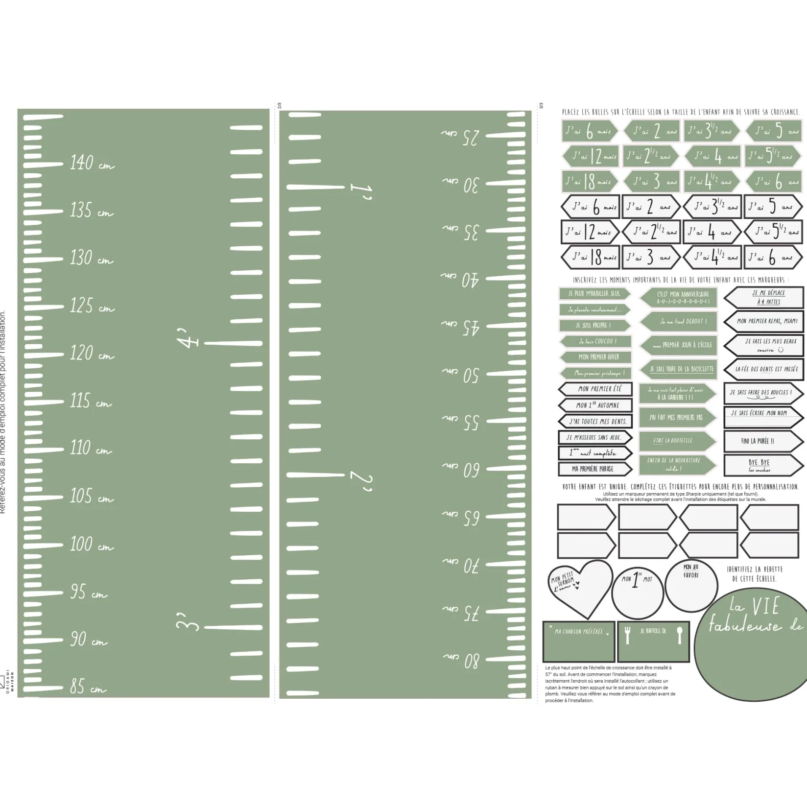 – The growth chart and all decorative elements are delivered on three sheets of self-adhesive vinyl, each 27 x 12 inches (69 x 30 cm), rolled in a sturdy cardboard box.