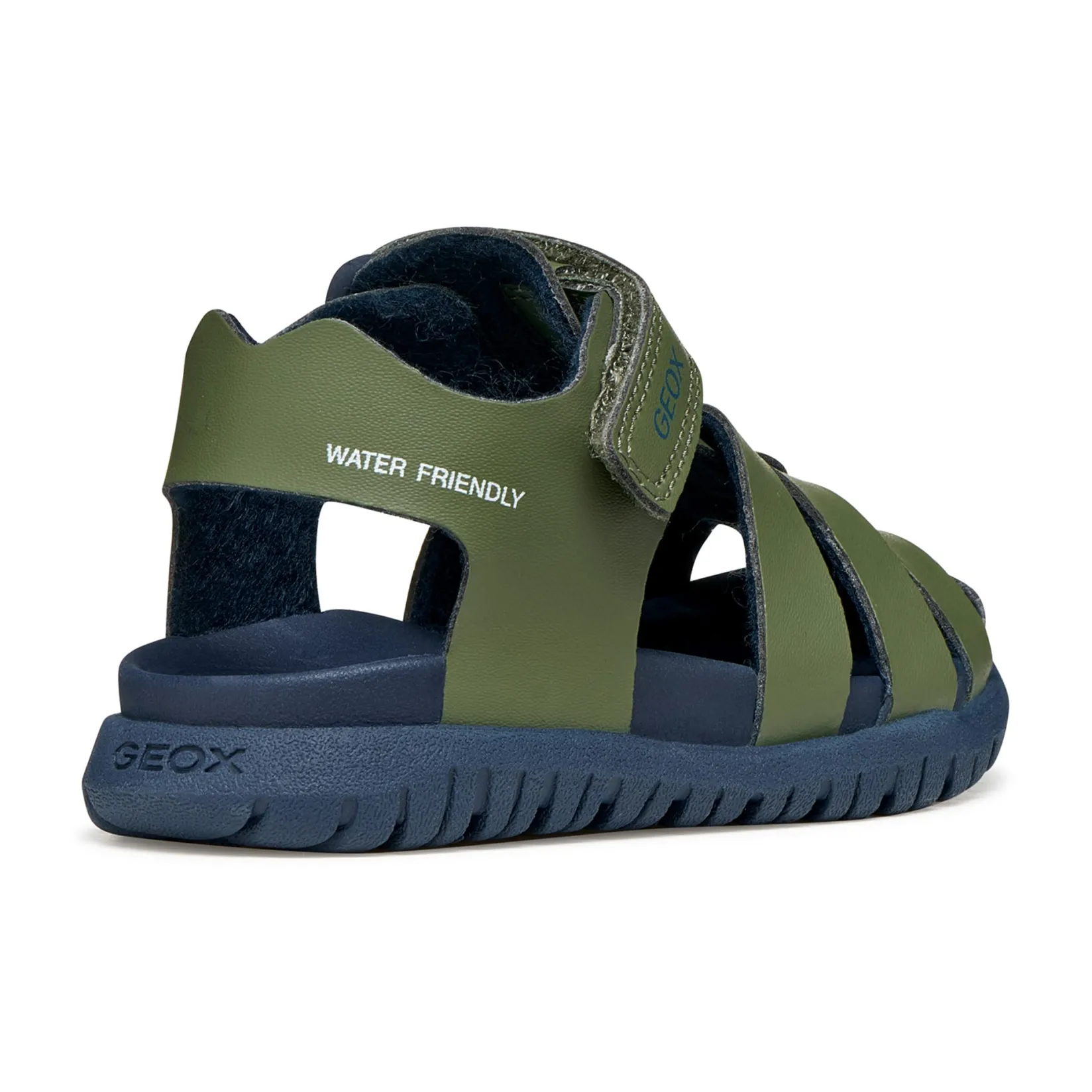 Comfortable lightweight open-toe sandal for boys with a modern dynamic design. This version of Fusbetto will prove to be a perfect partner for outdoor activities in warm weather. Crafted from a leather-effect material, this water-resistant flexible piece of footwear is easy to adjust and will provide children with all the freedom they need to run and play.
