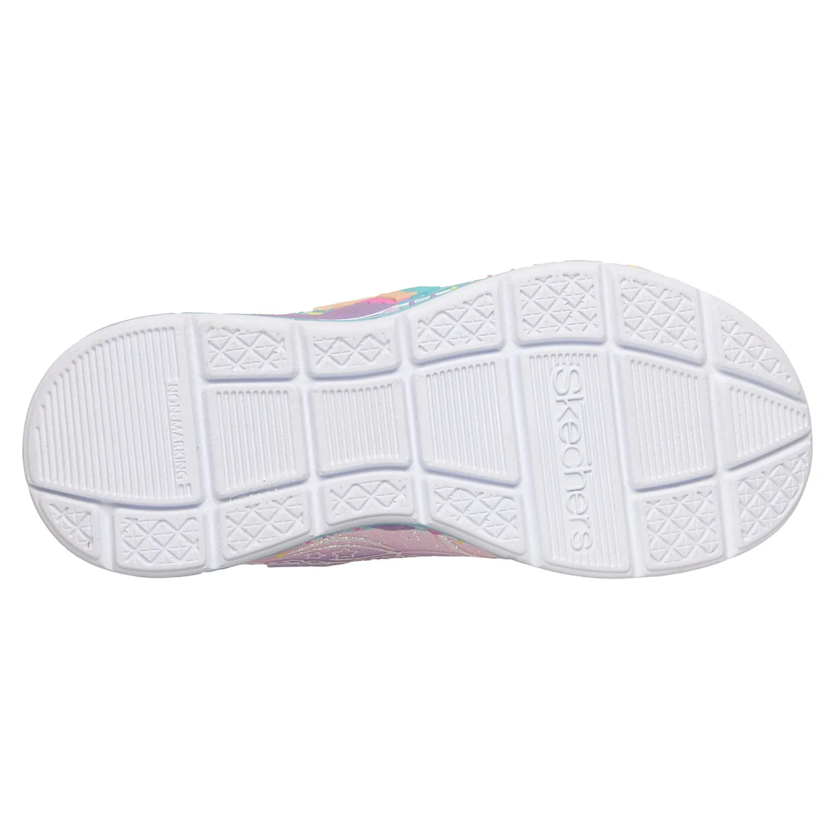 Sparkle and shine in style wearing Skechers S-Lights®: Mermaid Dreams. This sporty Magical Collection® lighted design features a mesh and synthetic glitter finish upper with stretch laces, mermaid themed light-up graphics, and a cushioned comfort insole.