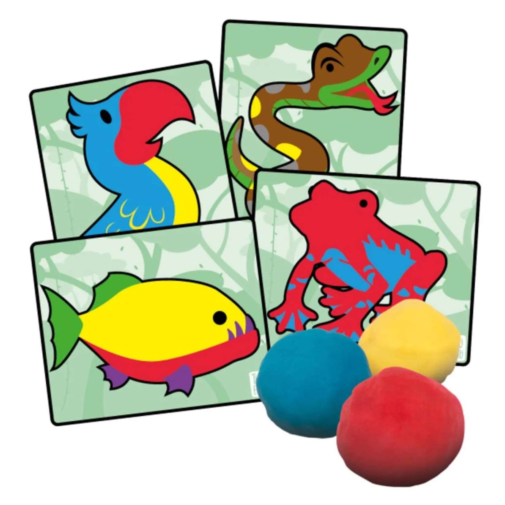 Three 100g tubs of scented modeling dough: cherry red, lemon yellow, cotton candy blue, four 5.5 x 4.5 inch double-sided animal cards: Pygmy Hippo – Reticulated Python – Chimpanzee – Piranha – Tiger – Leafcutter Ant – Macaw – Poison Dart Frog, one animal information pamphlet with color blending chart.