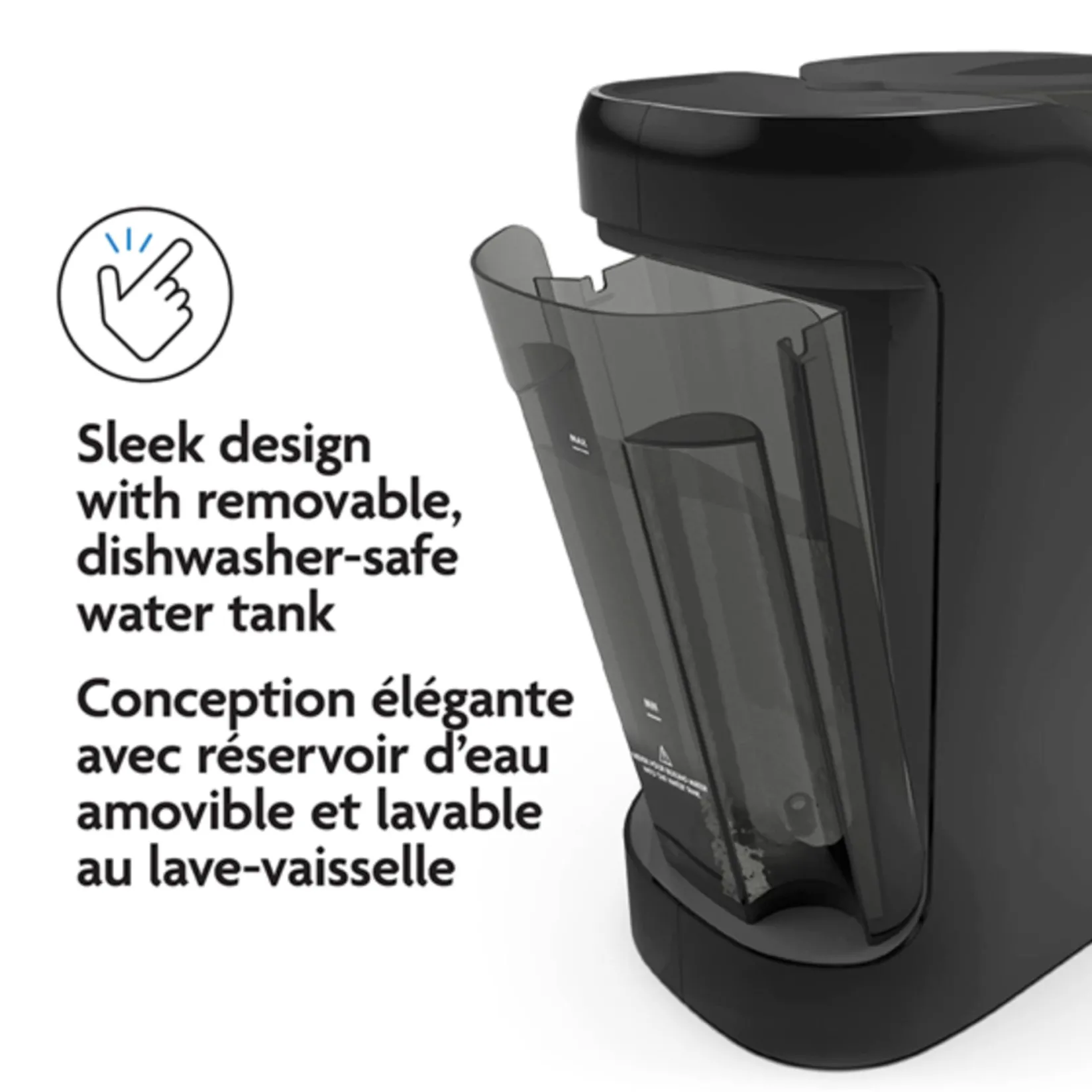 Stores formula in airtight powder container. Dishwasher-safe water tank.