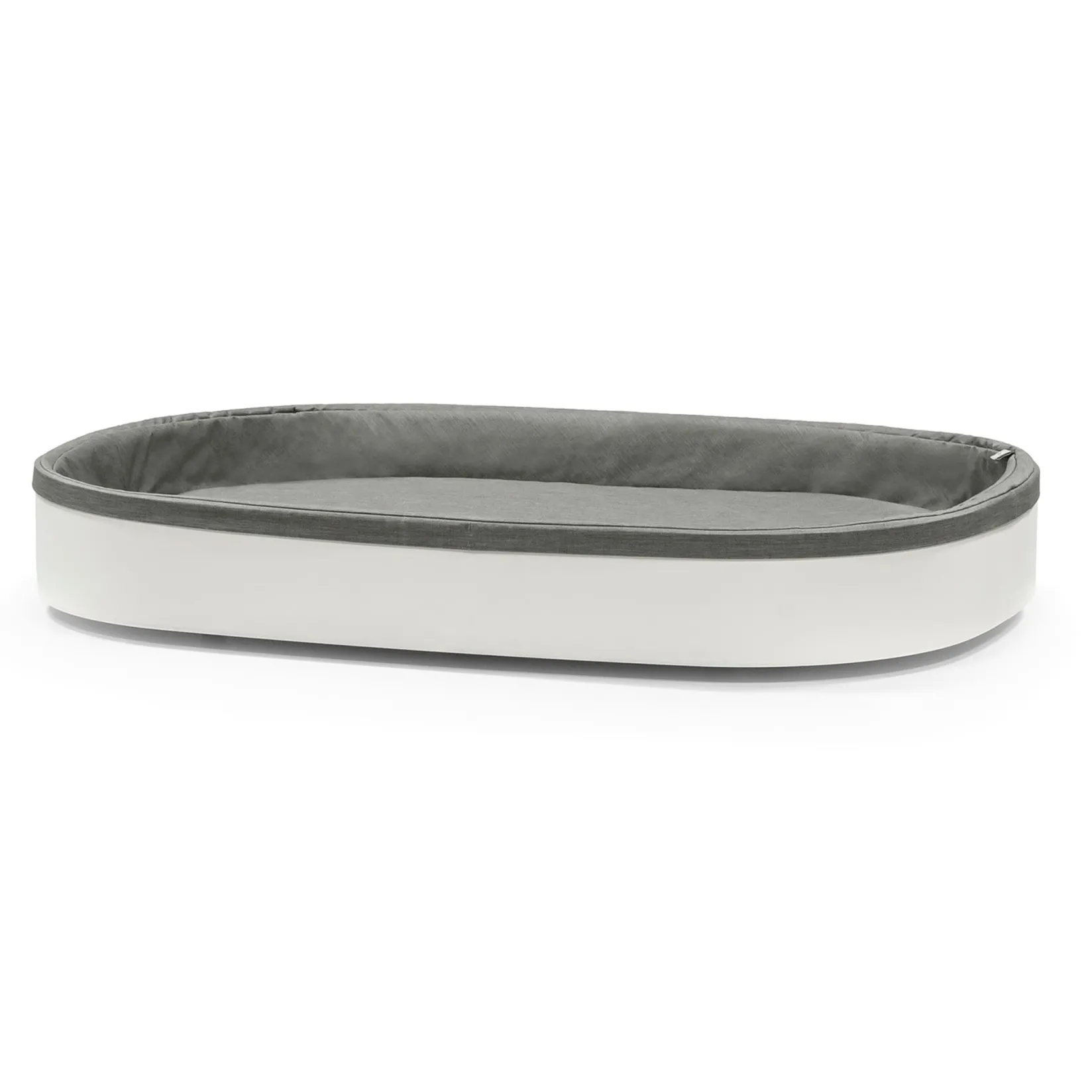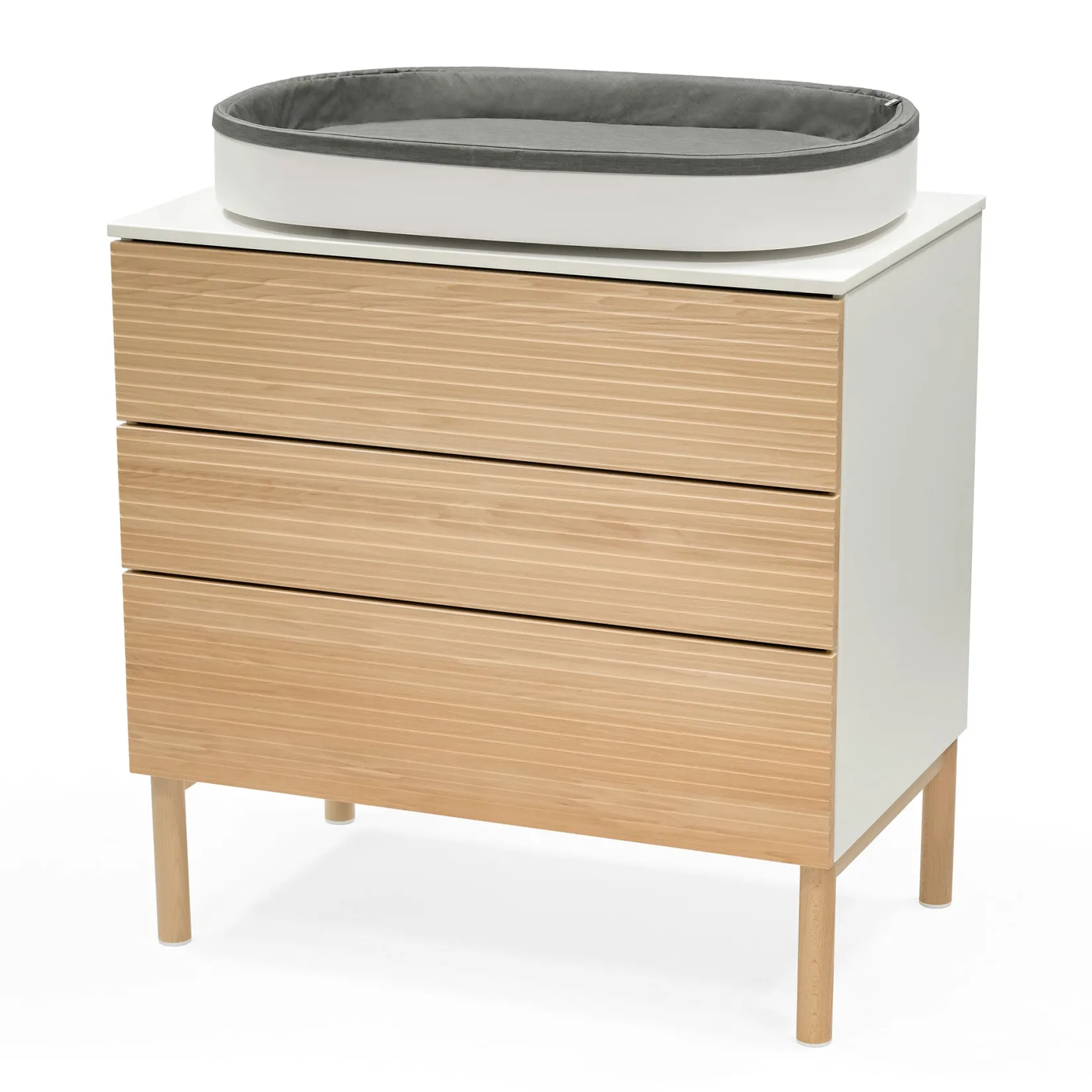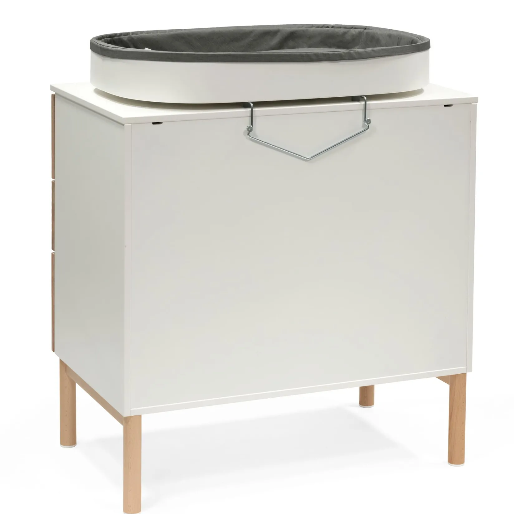 The changer can be safely used on top of the Stokke® Sleepi™ Dresser. Its protective sides and padded mattress offer a safe and comfortable environment for you to change your little one. The height of the Changer encourages eye-contact, and you can choose both sideway or parent facing position depending on the base unit and room. It comes with a water repellent changing pad with protective sides for baby. This changing pad is soft to baby’s skin, removable and machine-washable.