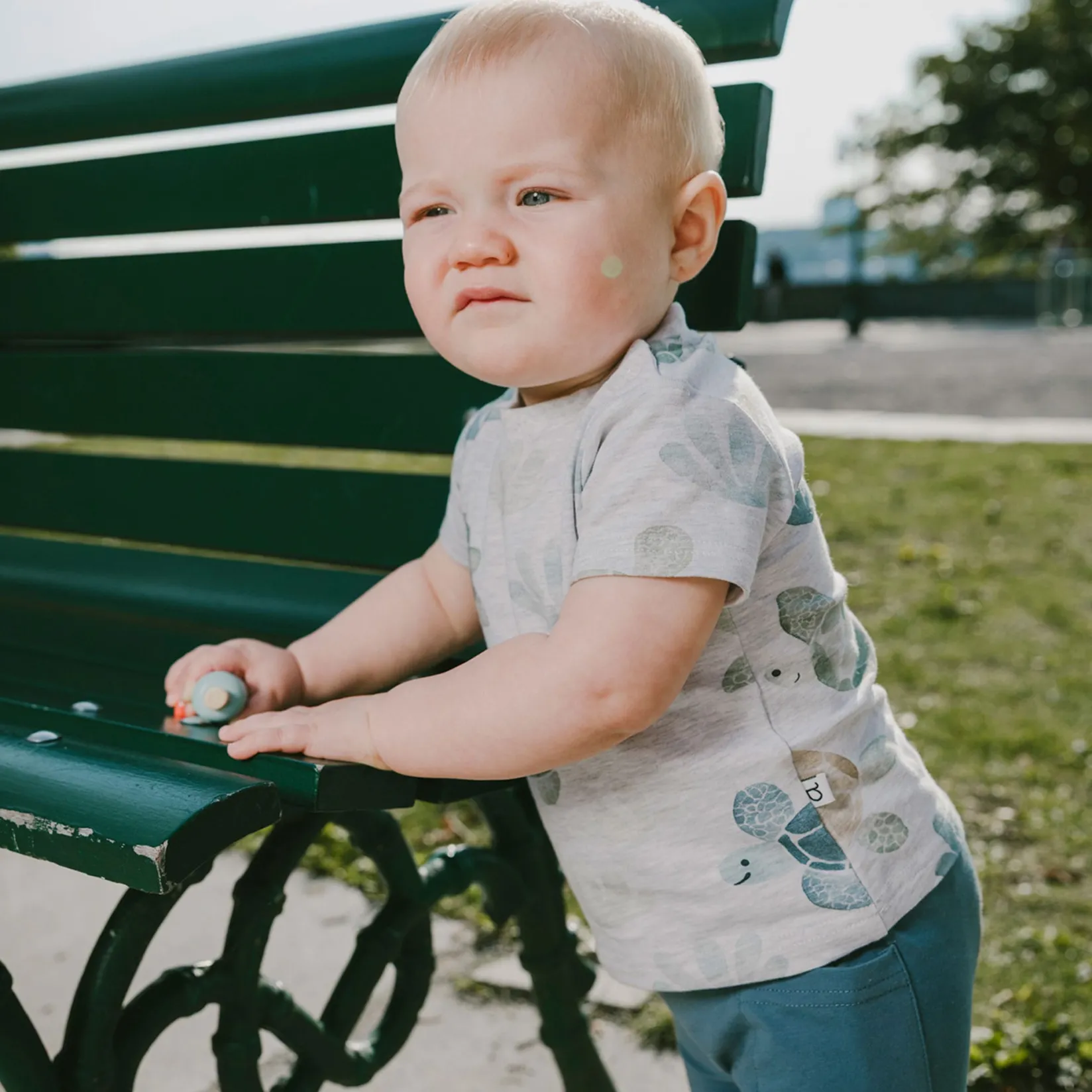 Fresh and fun, our jersey t-shirt and organic cotton shorts set grey mix with turtle print and medium blue brings a playful twist to everyday style. The top features a sweet allover turtle print with shoulder buttons for easy dressing, paired with solid medium blue shorts designed with side pockets for practicality. Made from soft cotton blends, this set keeps little boys comfy and ready for summer adventures.
