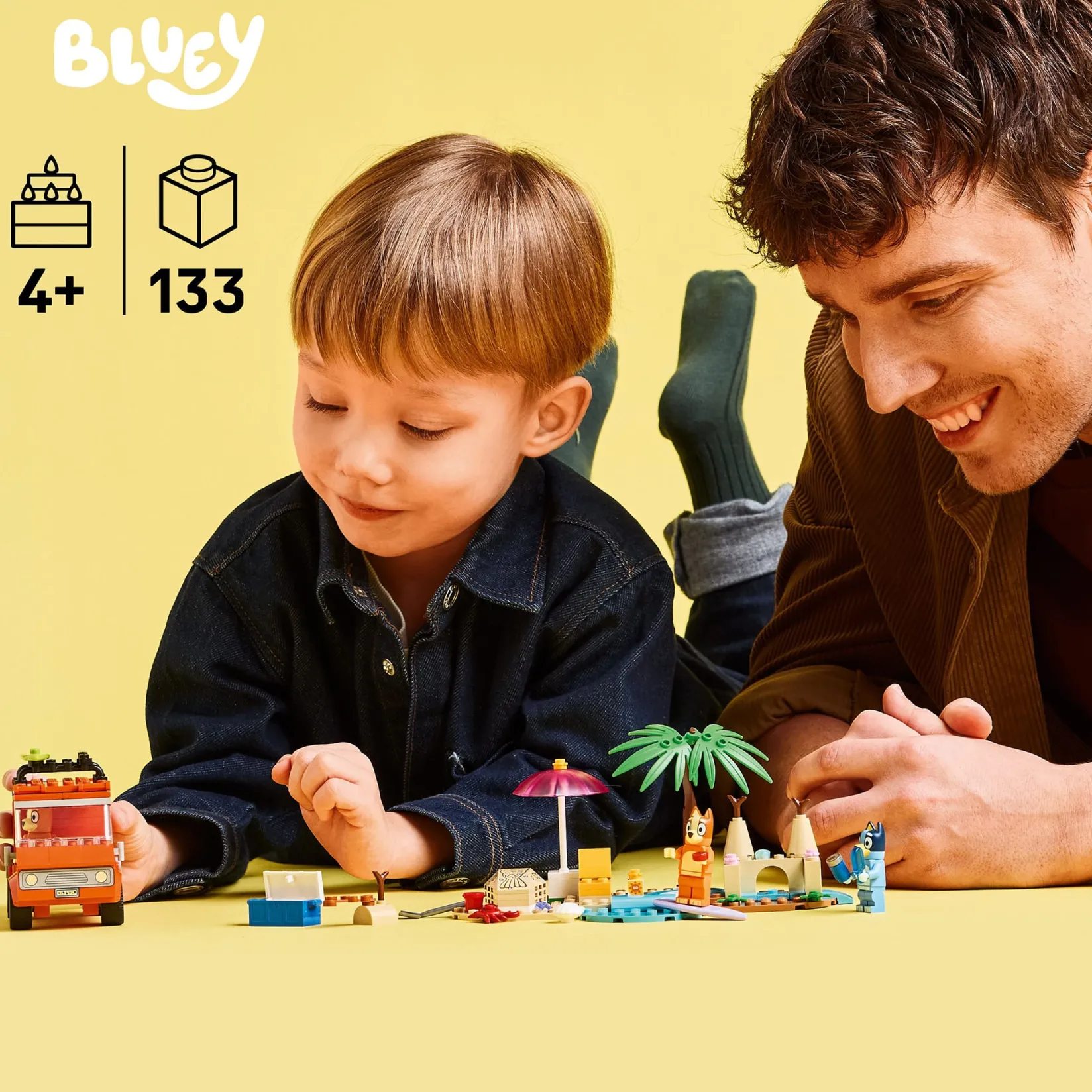 Bluey, Bingo and Chilli, Bluey’s mom, load up the car for a beach trip in this LEGO® Bluey playset for kids aged 4 and up.