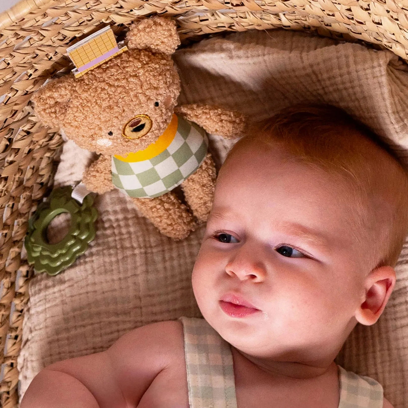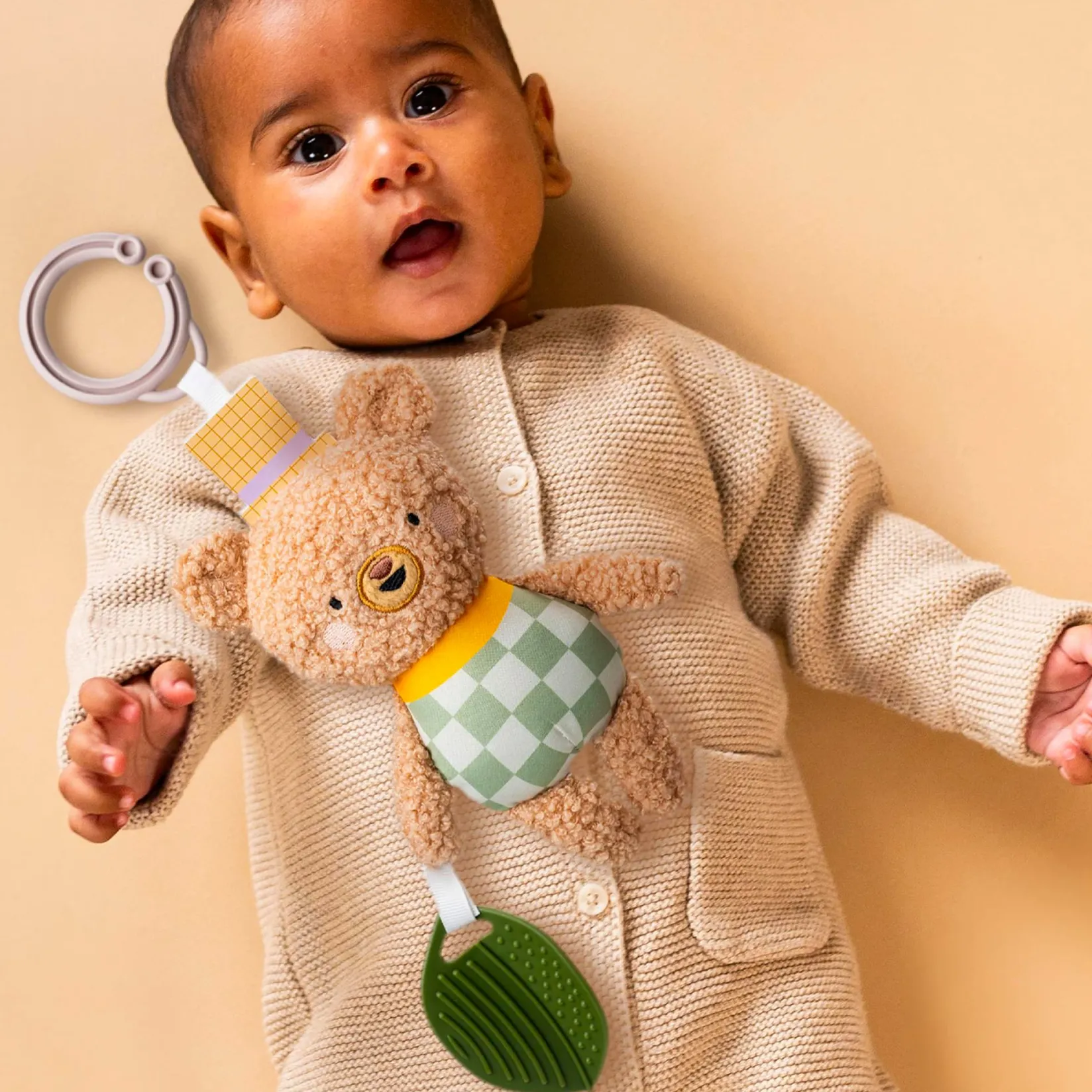 Provides a multi-sensory experience with various textures and patterns; Features a rattle ring for added auditory stimulation & a beet teether; Can be used as a teether toy to soothe baby’s gums; Crinkle details add to the sensory excitement; Conveniently attaches to a stroller, car seat, or infant carrier; Ideal for play at home or on-the-go; Made with safe and non-toxic materials, free from BPA, PVC, and Phthalates.
