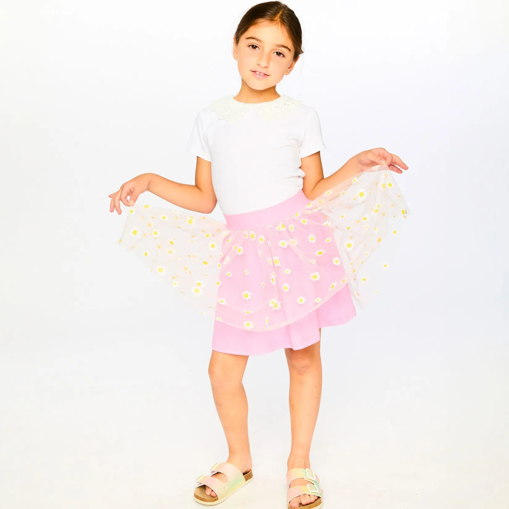 Light and twirly, our mesh and crinkle jersey skirt in pink adds a touch of magic to summer days. This flared skirt is designed with a soft elastic waistband, airy mesh overlay with charming daisy print, and a comfortable crinkle jersey lining for playful movement. Perfect for pairing with a t-shirt or blouse from the “Explosion Of Daisies” collection for a blooming look.