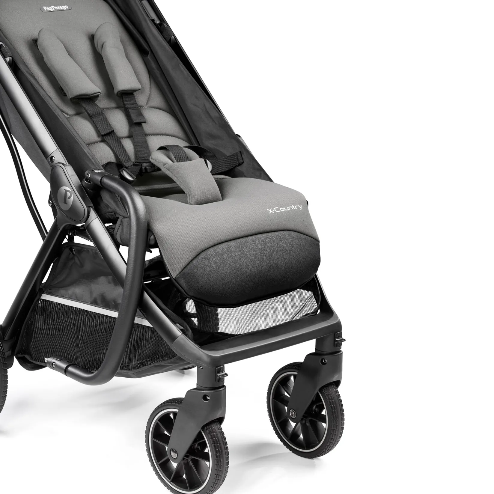 The Peg Perego X-Country Off-Road Compact Stroller keeps up on city sidewalks and off-the-beaten-path trails. Large rubber tires with tread, suspension, and ball bearings deliver a smooth, confident ride across all surfaces.
