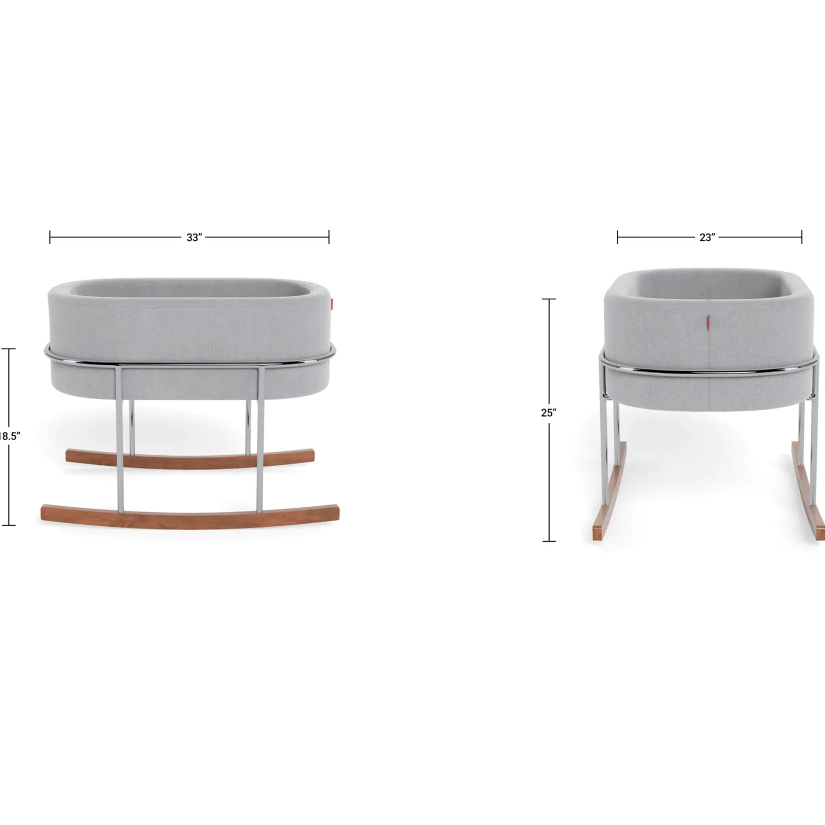 Our Rockwell bassinet is synonymous with ultimate modern luxury; it is the perfect combination of beautiful materials and a soothing rock for your little one. Its streamlined chrome stand with solid walnut rocking feet is beautifully contrasted to the soft upholstered basket that can be removed and transported to different rooms in your home (or the Grandparents’ home!). When you are finished with the bassinet, the basket alone makes an excellent spot to store all your baby’s new stuffies!