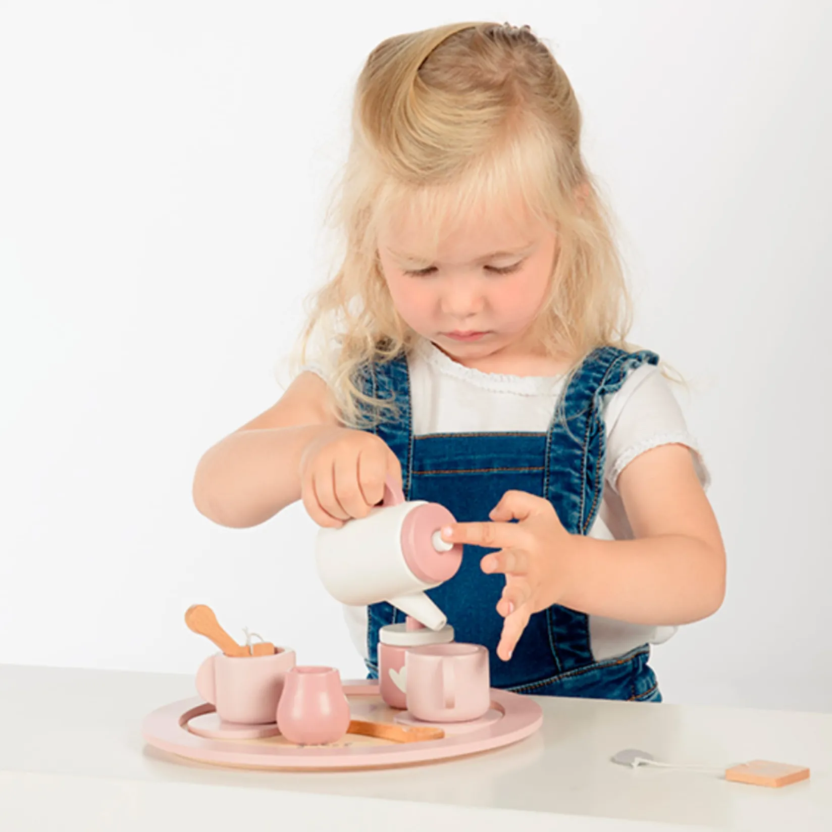 Such a cute tea set! Not only mom & dad, brother & sister, but also the dolls are being served with the most delicious home-made tea. And who knows… with some pastry. You will see the most cozy role-playing games. The set consists of a teapot, 2 cups + saucer, 2 spoons, 2 tea pouches, a sugar bowl and milkjug. Everything is served on a fabulous wooden tray, maybe a bit balancing in the beginning, but your little waitress will master this in no time. This festive occasion is the ideal complement for the fantasy game of each child. Both imagination and creativity are stimulated. Children will learn to interact with others while playing and practice logical reasoning and eye-hand coordination.Â