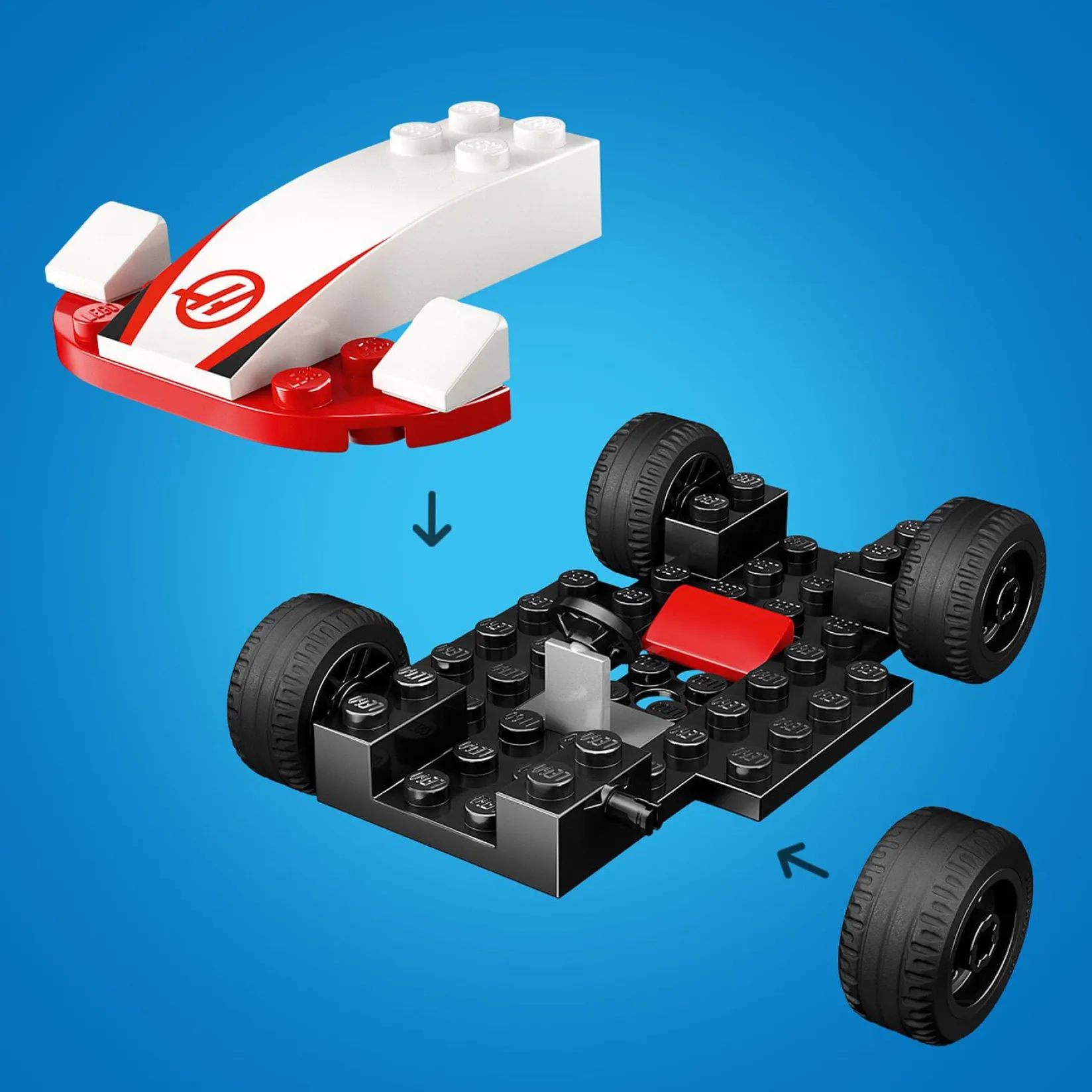 The LEGO® City F1® Williams Racing and Haas F1® Race Cars set includes 2 F1 cars and 2 driver minifigures for epic races.