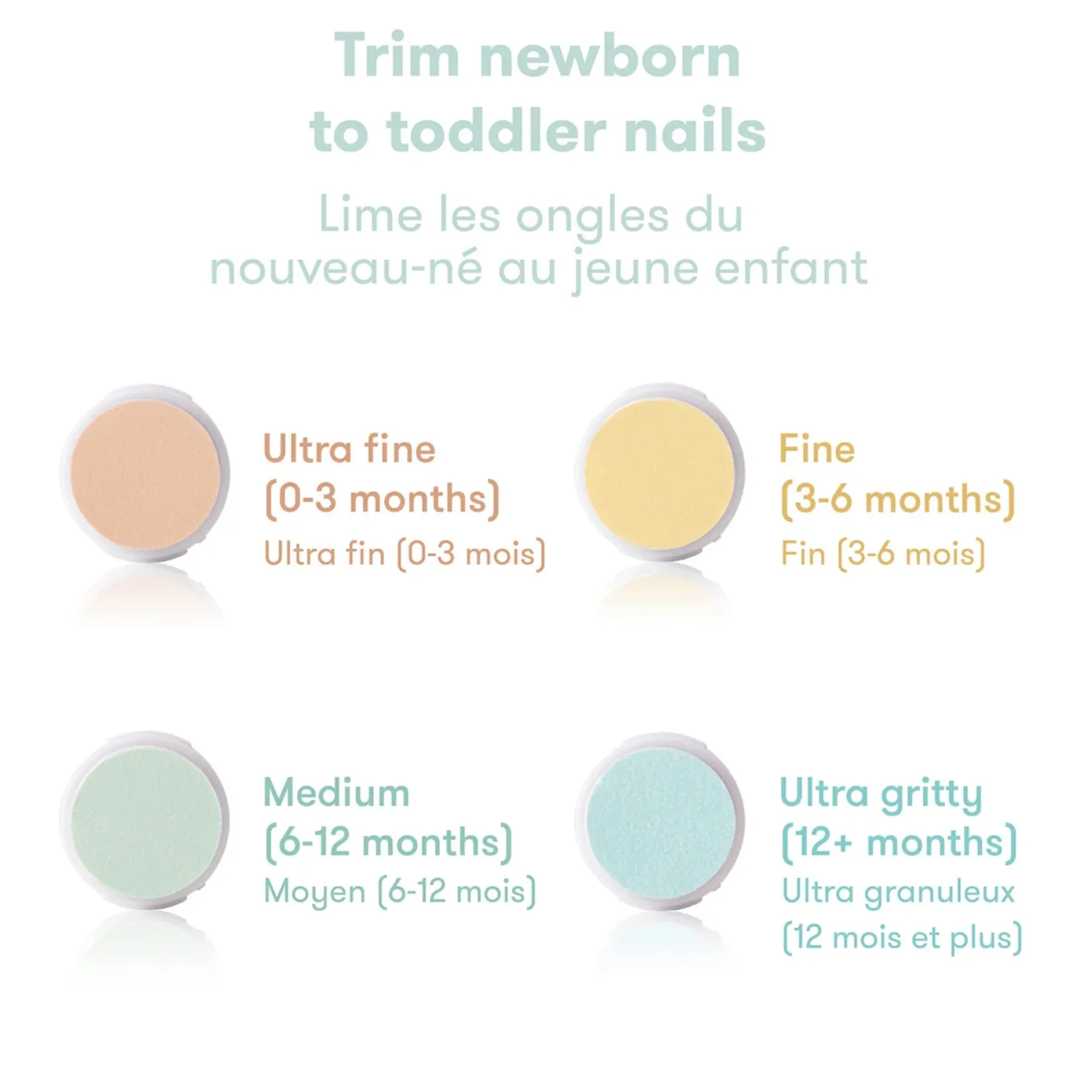 EASY-TO-USE: Easily change speed, direction, and grit with four interchangeable buffer pads for newborn nails to kid claws (Orange: Ultra fine, Yellow: Fine, Green: Medium, Blue: Ultra Gritty)