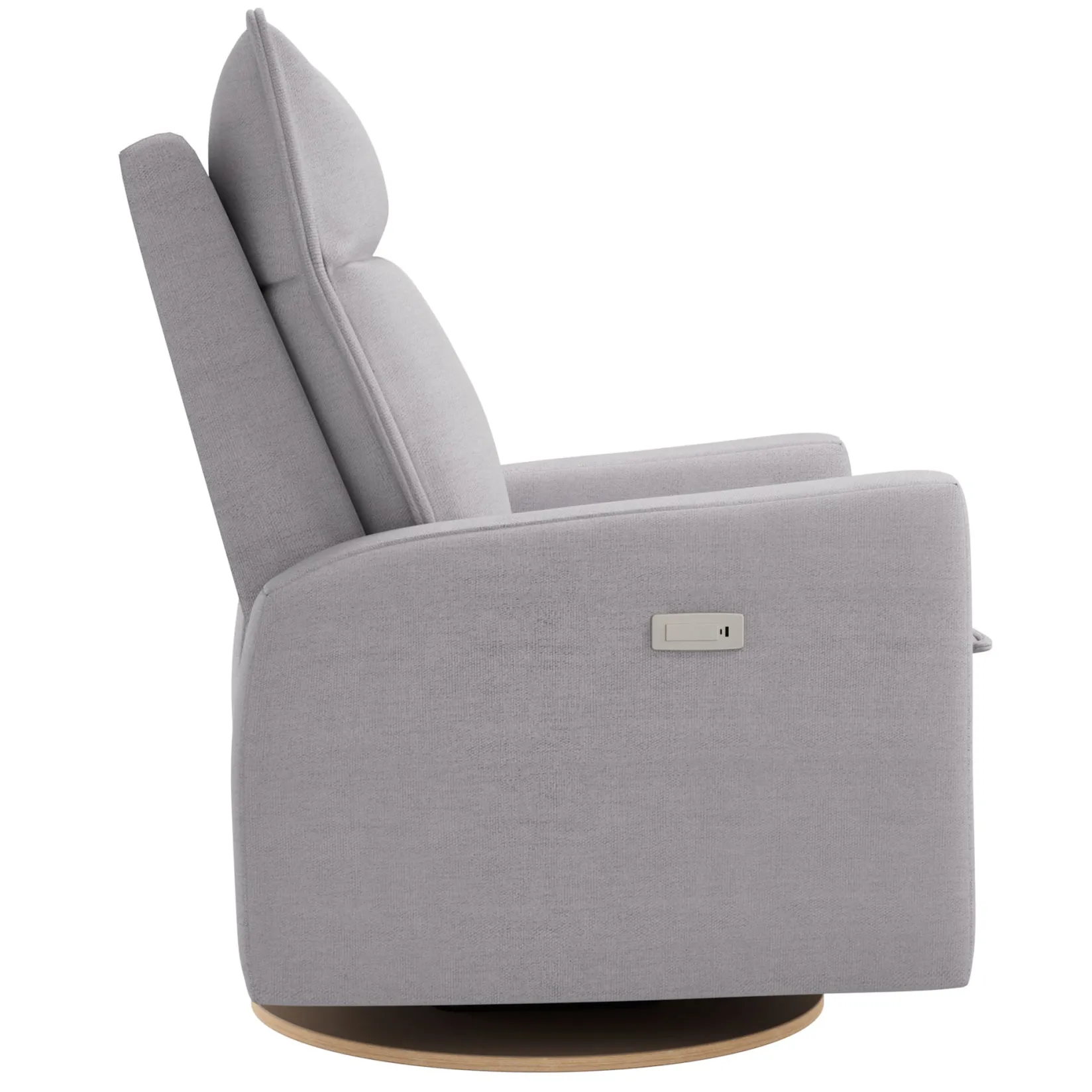 The new Arya power reclining chair brings an elegant, relaxed, and comfortable style to baby’s rooms. Its plush cushions allow you to sink into the chair and find the ideal position for ultimate relaxation.The power version offers smooth motorized reclining, with a control panel built into the armrest featuring buttons to control the recline, as well as USB and USB-C ports to keep electronic devices within reach.The recliner swivels with a smooth rocking motion, so you won’t disturb your little one’s sleep while settling in comfortably.