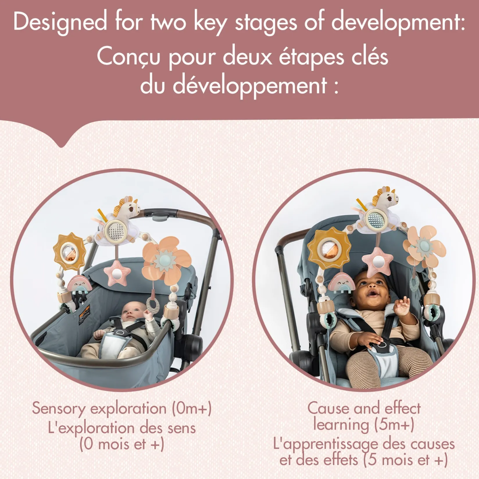 Adaptable to most strollers, it offers two stages of development : sensory exploration from 0 months and learning cause and effect from 5 months.Â