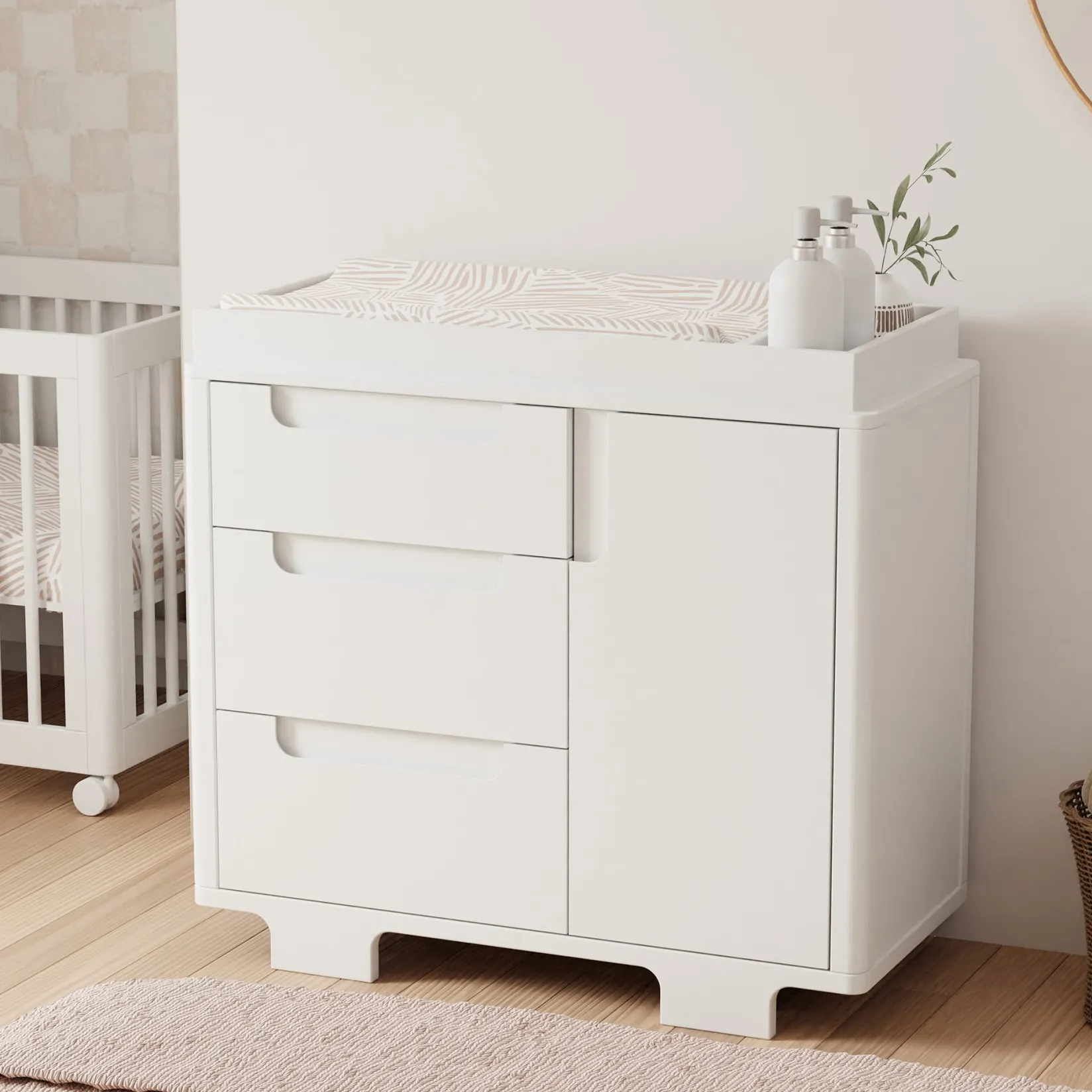 Designed to complement the Yuzu 8-in-1 All-Stages Crib, the Yuzu 3-Drawer Changer Dresser marries form and function with playful arched feet, gently curved corners, included changing tray, and plenty of storage with 3 drawers and 1 spacious cabinet. Whether you’re going for a classic, modern, or eclectic look, this versatile dresser is a perfect statement piece in the nursery.