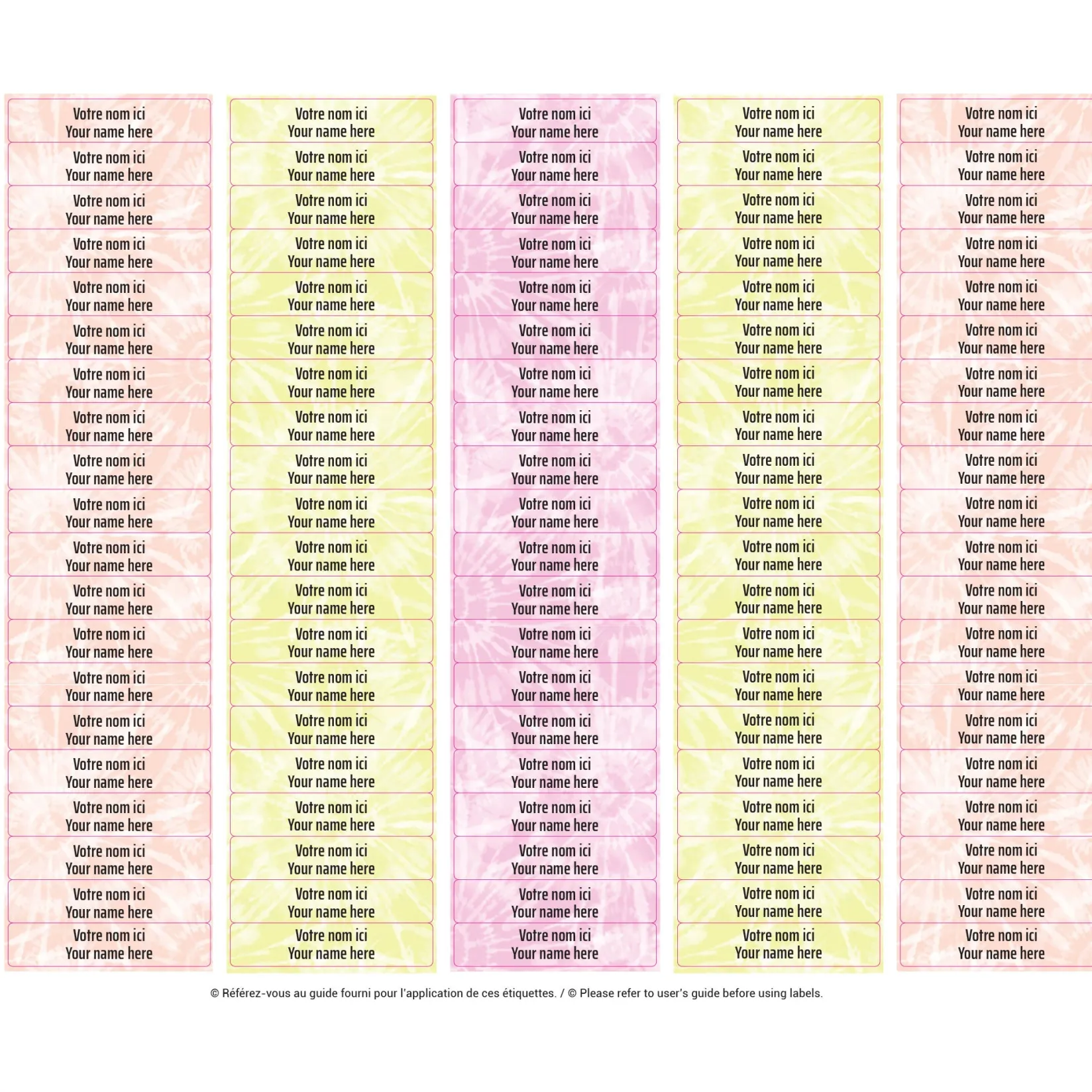 It contains 225 self-adhesive labels of various sizes to effectively identify any type of item. The labels are resistant to water, cold, heat, and steam. They are dishwasher, washing machine, dryer, microwave, freezer, and refrigerator safe. No ironing required: apply them to a clean, dry surface, then wait 24 hours before exposing them to moisture or heat. The name and/or phone number is printed on two lines of 16 characters.