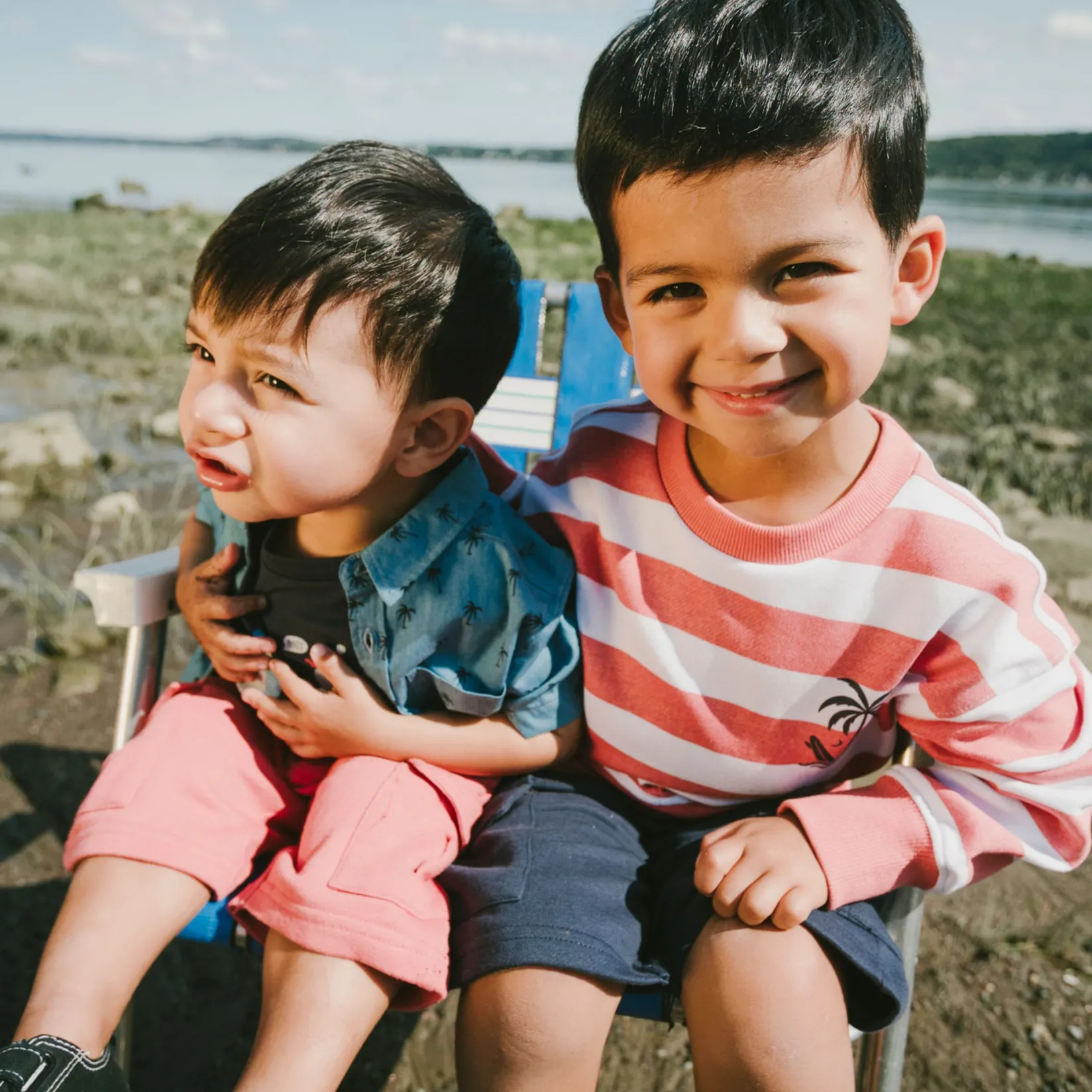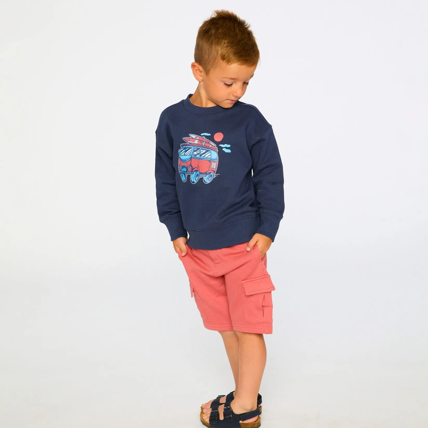 The French terry shorts in blue are a comfy yet practical summer essential for boys. These bottoms are designed with an elastic waistband for easy pull-on wear, slit side pockets, and functional cargo pockets for a casual utility look. Made from soft cotton-blend French terry, they are perfect for play and everyday adventures in the “Coastal Days” collection.