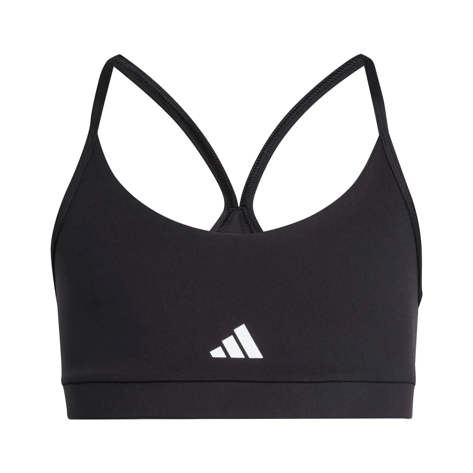 Introducing the Train Essentials Soft Touch Bra, a workout essential for girls. This medium support bra is made in part with recycled materials, featuring a blend of 75% recycled Polyethylene Terephthalate and 25% Elastane. Equipped with Climacool technology, it ensures a cool, dry, and distraction-free performance by effectively wicking away sweat. The tight, knit construction and cross-back design offer a secure fit and medium support, making it a perfect companion for your workouts.