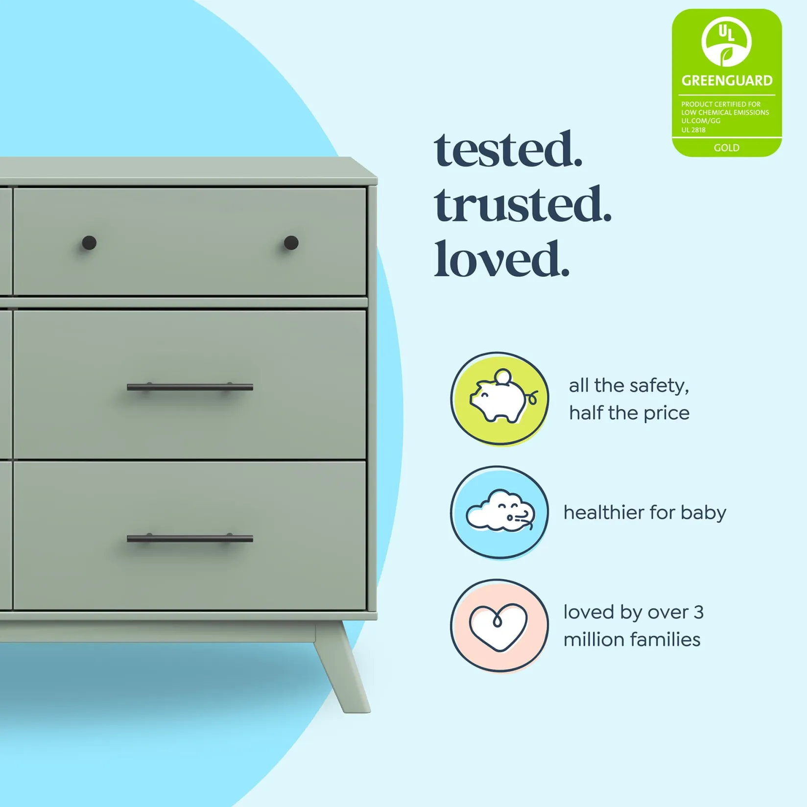 DaVinci Baby offers the largest selection of GREENGUARD Gold certified cribs on the market. Tested for over 10,000 chemicals, these cribs are certified low-emission and contribute to cleaner indoor air. Each of their products is thoughtfully designed with your family in mind and carefully tested so you can rest easy knowing your child is safe.
