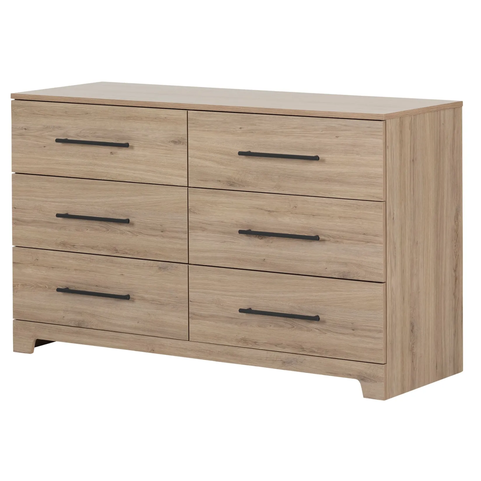Contemporary Lines And Finish This Primo 6-drawer dresser has a timeless look and blends in easily with any decor. The contemporary lines are softened by the curved kick plate, and metal handles add character and value to the furniture. The neutral, modern style makes it suitable for men’s, women’s or kids bedrooms, providing plenty of storage space in this attractive piece of furniture.