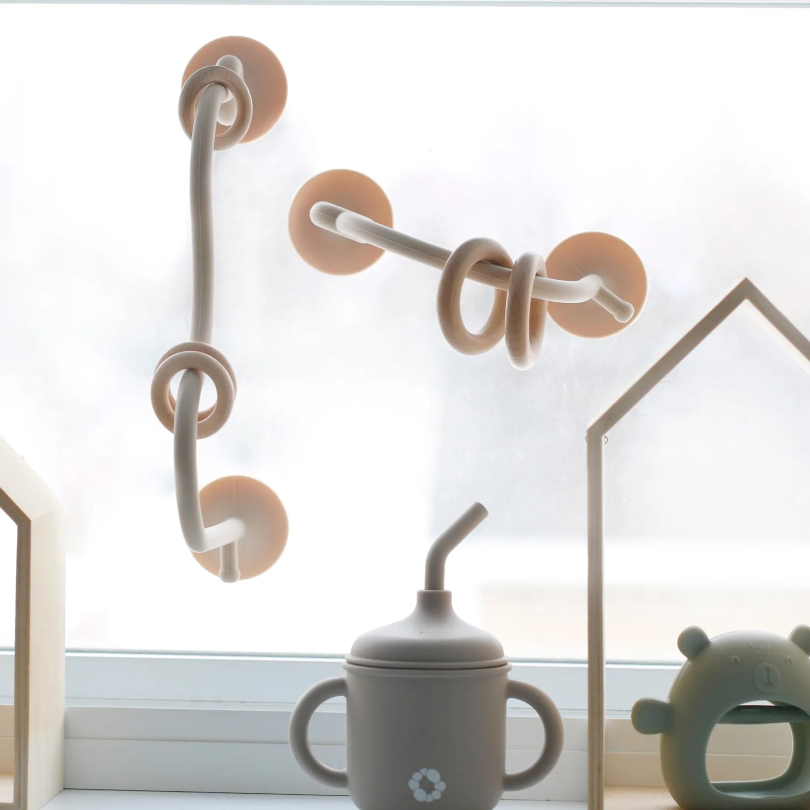 Made of food-grade silicone and pretty beech wood rings, our Suction Toy allows your little one to explore different textures while developing their fine motor skills. It also helps relieve pain associated with teething.