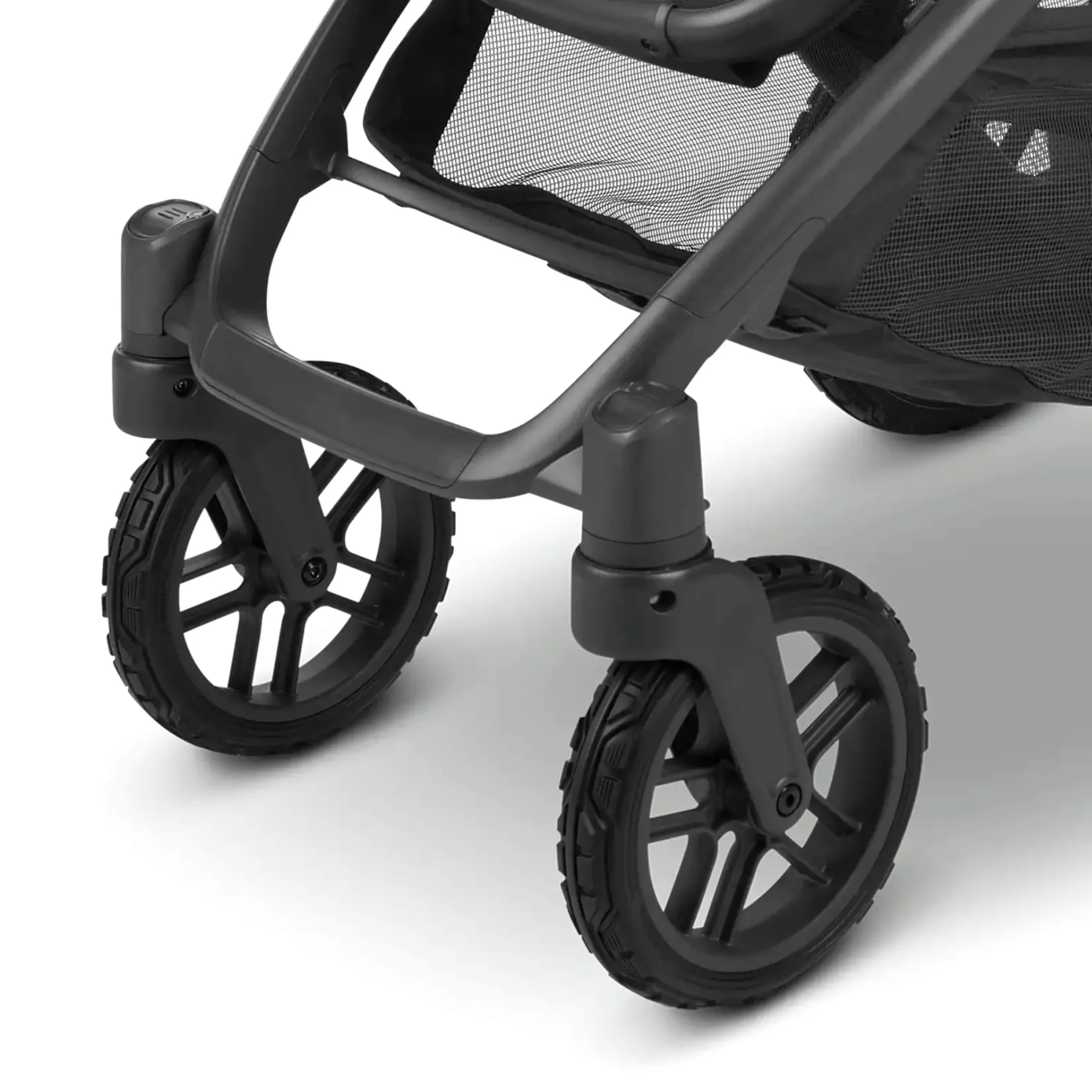 Introducing our pioneering All-Terrain Wheel Kit, carefully engineered to optimize the performance of your Vista stroller on challenging terrains. With four rugged, never-flat wheels and a convenient storage bag included, this innovative kit is thoughtfully designed to effortlessly navigate through snow, cobblestone, and uneven surfaces