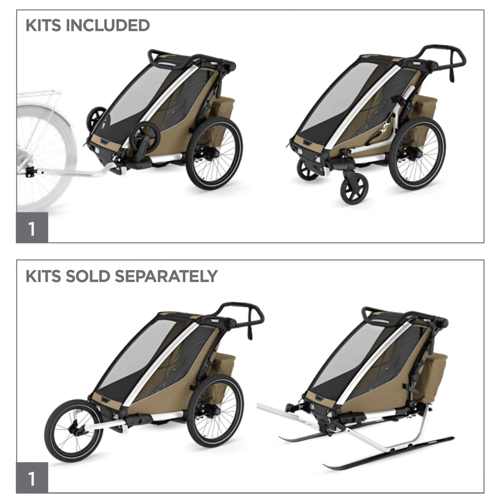 -4 activities – designed to excel when you bike, jog, stroll, and ski (Jogging and Ski Kits sold separately). The included rain cover and sun canopy keep your child dry and shields them from the sun