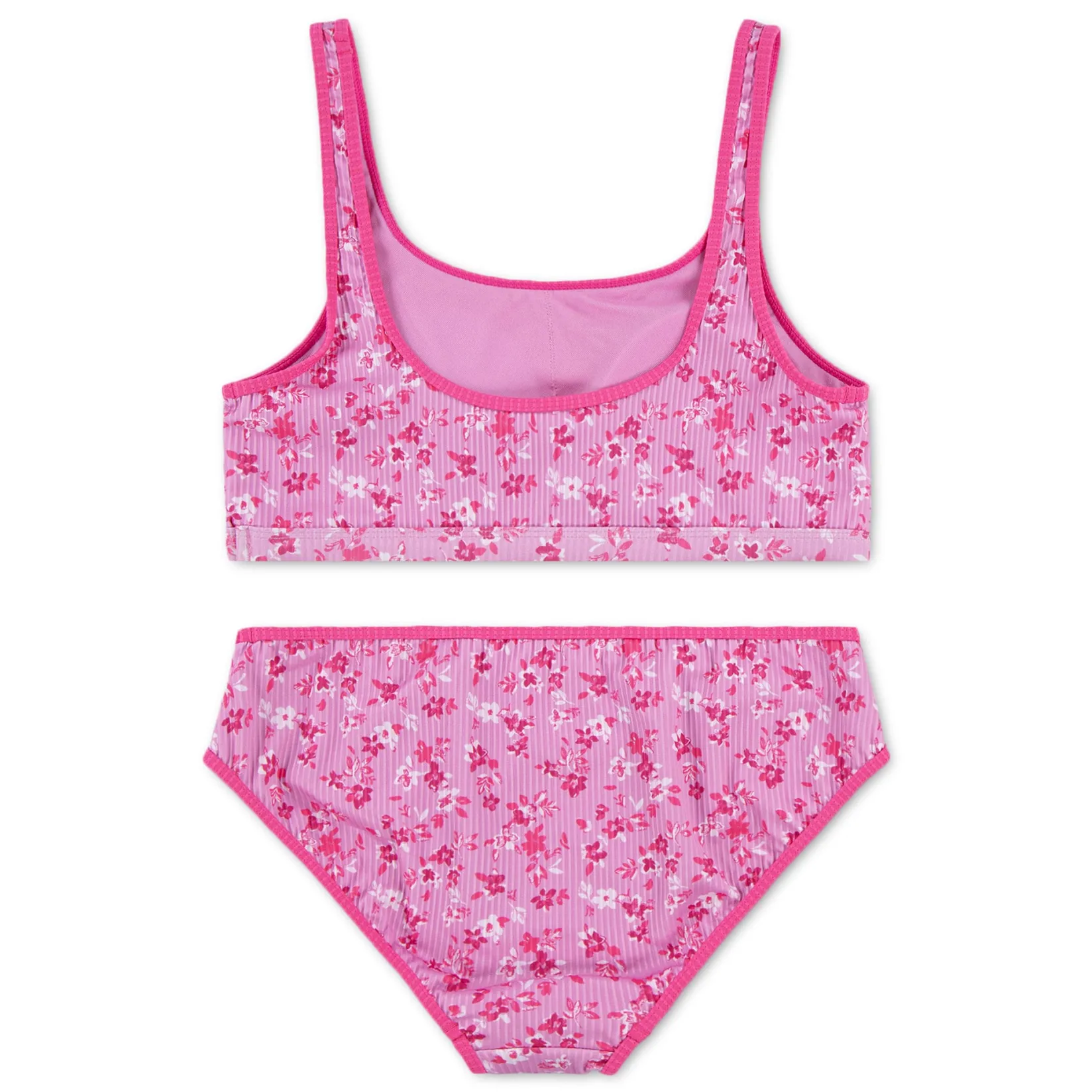 Both pieces are made of jacquard swim rib knit fabric and finished with an allover floral print Top: Double scoop neck. Encased elastic band. Fully lined • Bottom: Bikini cut. Encased elastic waistband. Solid binding trim. Fully lined