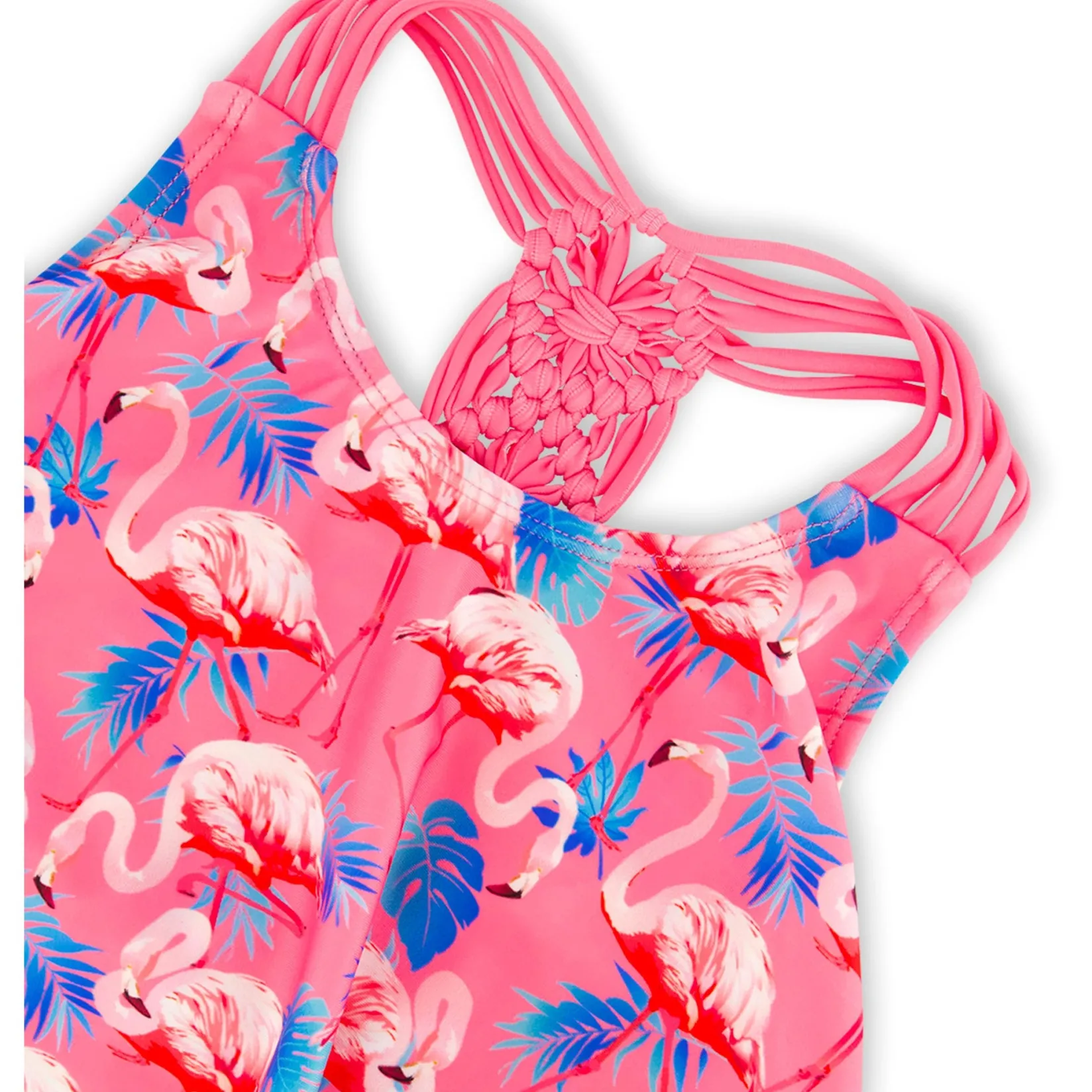 Offering a bold tropical style, our candy pink flamingo print two-piece swimsuit is a must-have for the spring and summer seasons! This adorable swimsuit has a ruffled top with multi-string straps, a macrame accent at the back, and a scoop neck. We paired it with coordinating solid pink bikini bottoms with flamingo print side ties.