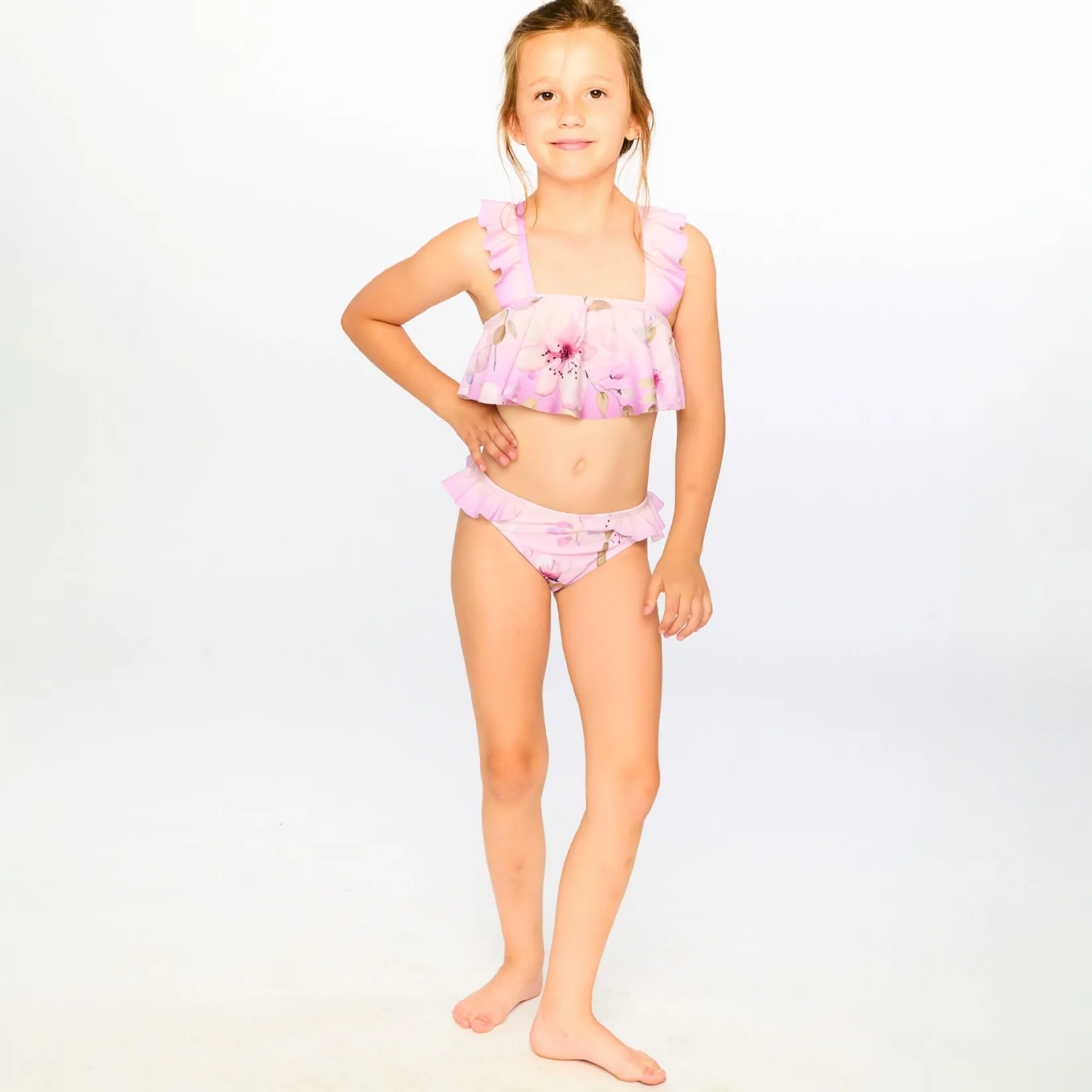 The two-piece swimsuit in purple with flower print is a sweet and playful set with ruffled crossed straps and a flared top. Made from recycled polyester with a touch of stretch, this swimsuit offers comfort, flexibility, and durability for summer adventures. A stylish and eco-friendly design from our “Like A Fish To Water” collection.