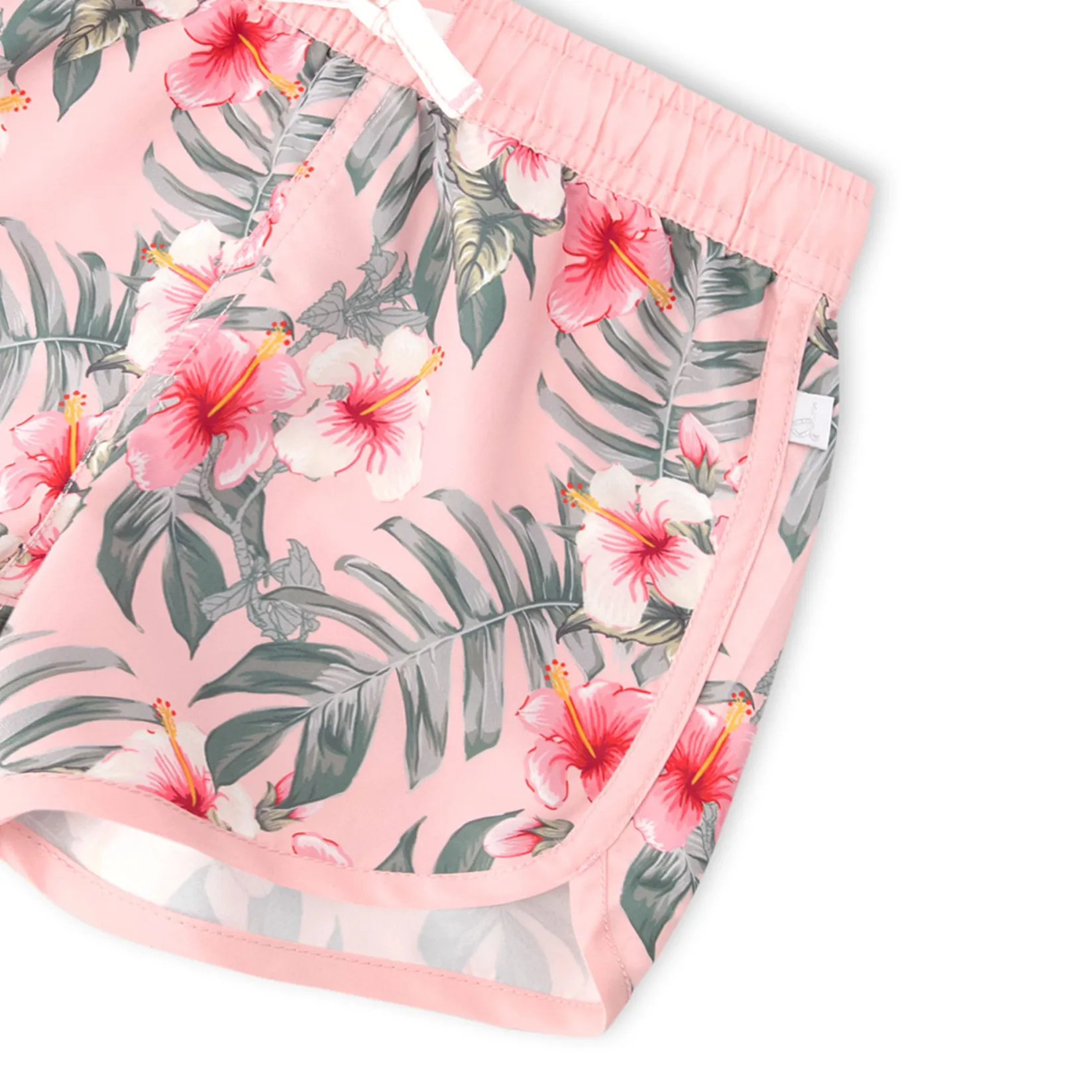 The swim shorts in pink with hibiscus print bring a bold and playful twist to beach days. Designed with a tropical hibiscus pattern over a pink background, these bottoms feature an elastic waistband with an adjustable drawstring for a secure fit. A curved hem adds comfort and style, while recycled polyester with a soft lining completes the “Like A Fish To Water” collection with energy and flair.