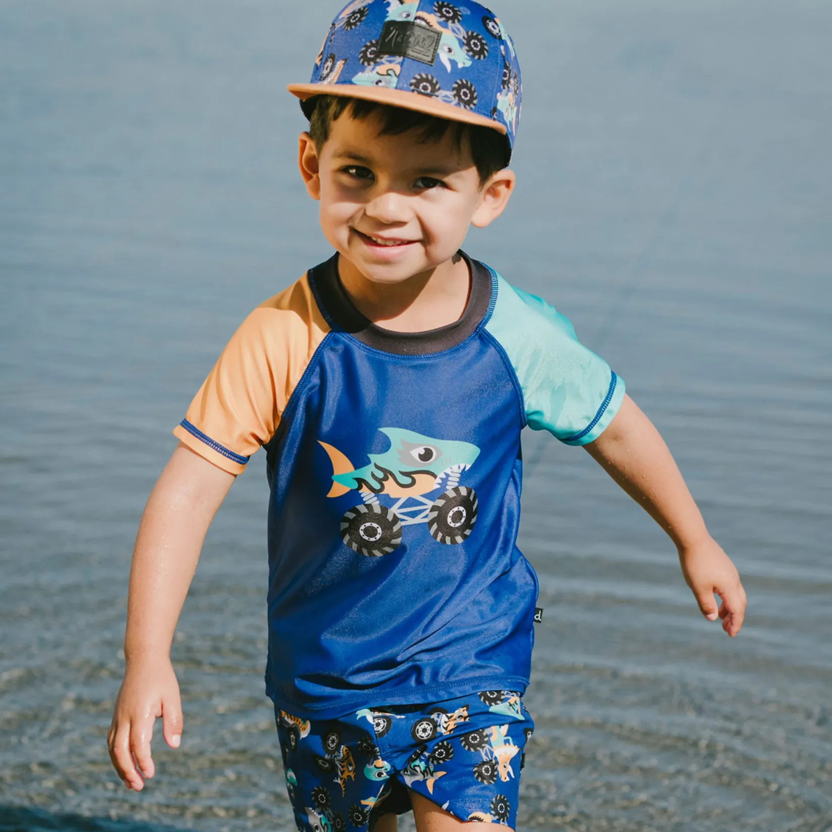 Our short sleeve rashguard in ultramarine blue adds a fun twist to sun-safe swimwear. This swim top features short contrast sleeves and a bold shark monster truck print at the front, crafted from recycled polyester with stretch for easy movement. Quick-drying and comfortable, it offers reliable sun protection for boys during all water adventures.