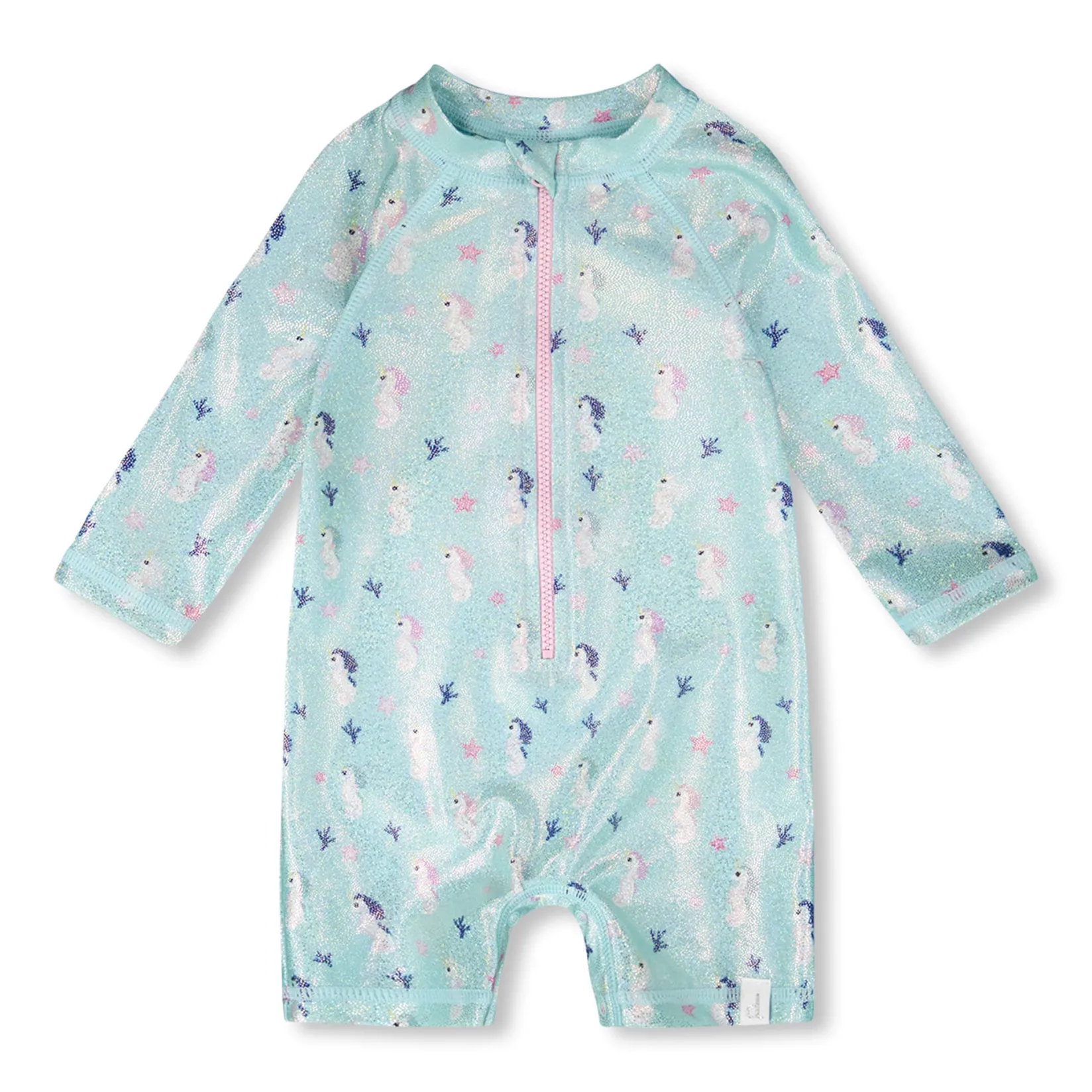 The baby and toddler one-piece long sleeve rashguard in blue with seahorse print is a playful essential for little girls at the beach or pool. This long-sleeve swimsuit features an allover seahorse print on a soft blue background, a mock neck, bottom-snap closure and a front zipper for easy dressing. Made from recycled polyester with added stretch, it offers sun protection, comfort, and style for splashing around all summer long.