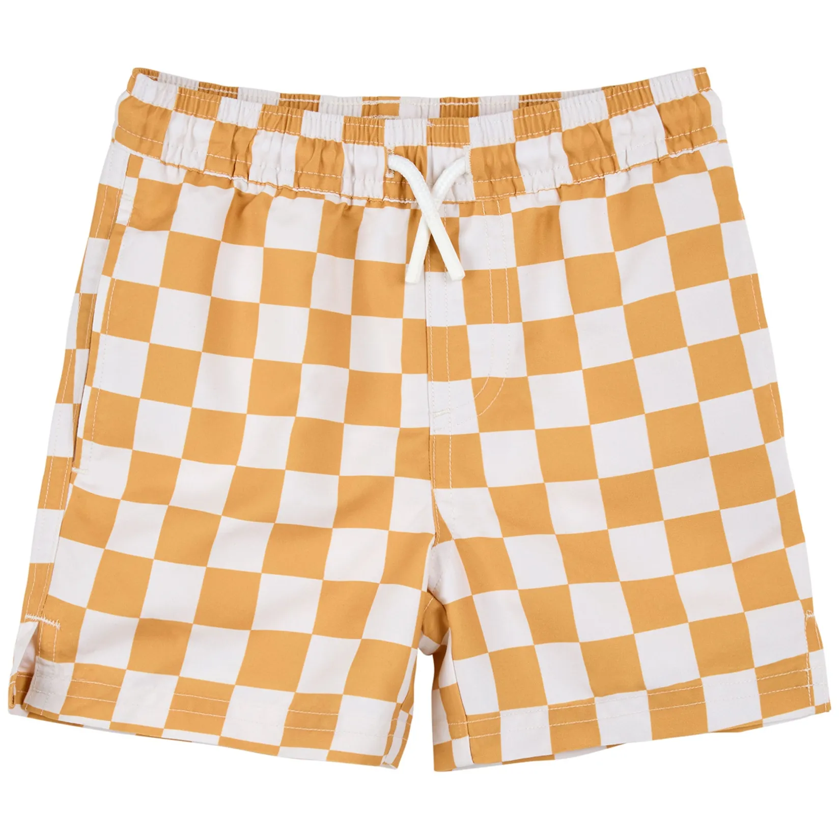 These skater-boy swim shorts are printed with an orange checkerboard pattern that coordinates perfectly with swimwear available for the whole family. Made from woven microfiber, and fitted with an elasticated, drawstring waistband, the trunks are light and comfortable for all day wear if you struggle to get them to take a break. The trunks have built-in sun protection, and there’s long-sleeved rash guards for coordinating if he needs a little extra coverage.Â