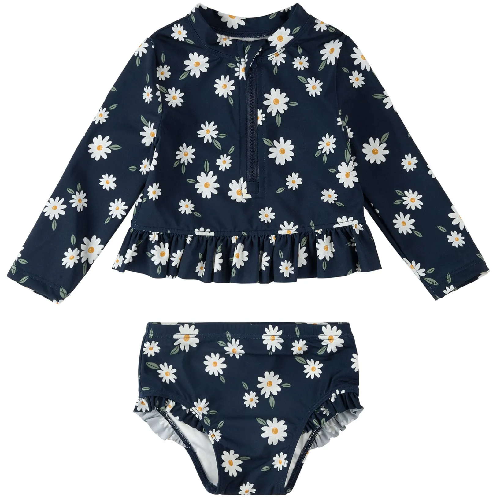 Bringing a classic summery style to a pool or beach near you, this Daisies print rash guard set is perfect for splashing in the pool or building sandcastles at the beach. The 2-piece set includes a long-sleeved rash guard and high waisted pants, both helping to keep her delicate skin covered in the sun. Made with quick-drying weft knitted fabric, the set is comfortable wet or dry and is designed with UPF50+ sun protection. The cheerful set is stretchy, practical and fun, giving her the confidence to play freely on sunny days.Â