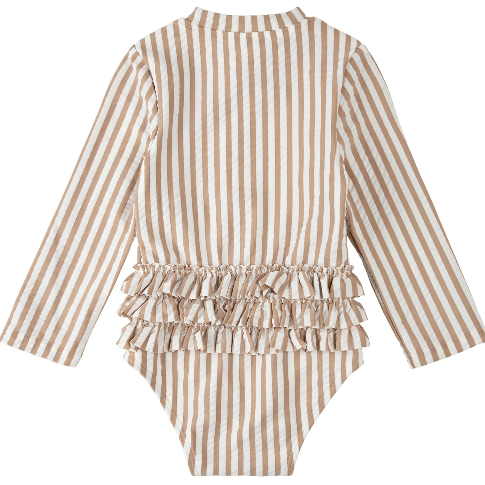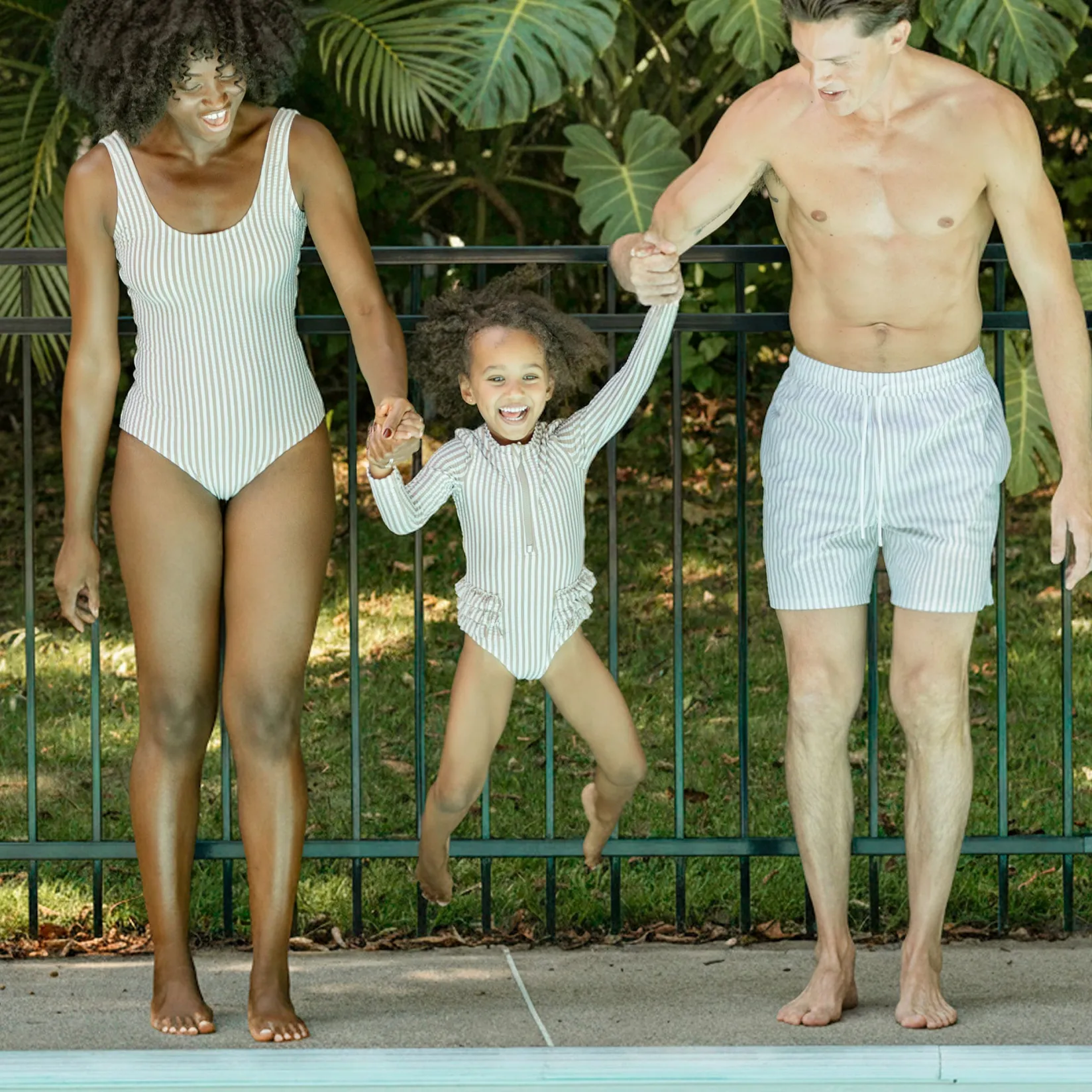 Made for family days by the sea, this taupe stripe, seersucker bodysuit coordinates effortlessly with swimwear available for the whole family. Keeping her comfortable through every giggle and splash, the swimsuit provides full coverage with its long-sleeved design and built-in UPF50+. The front zipper makes dressing quick and fuss-free, so spontaneous dips and sandy adventures are always an option.