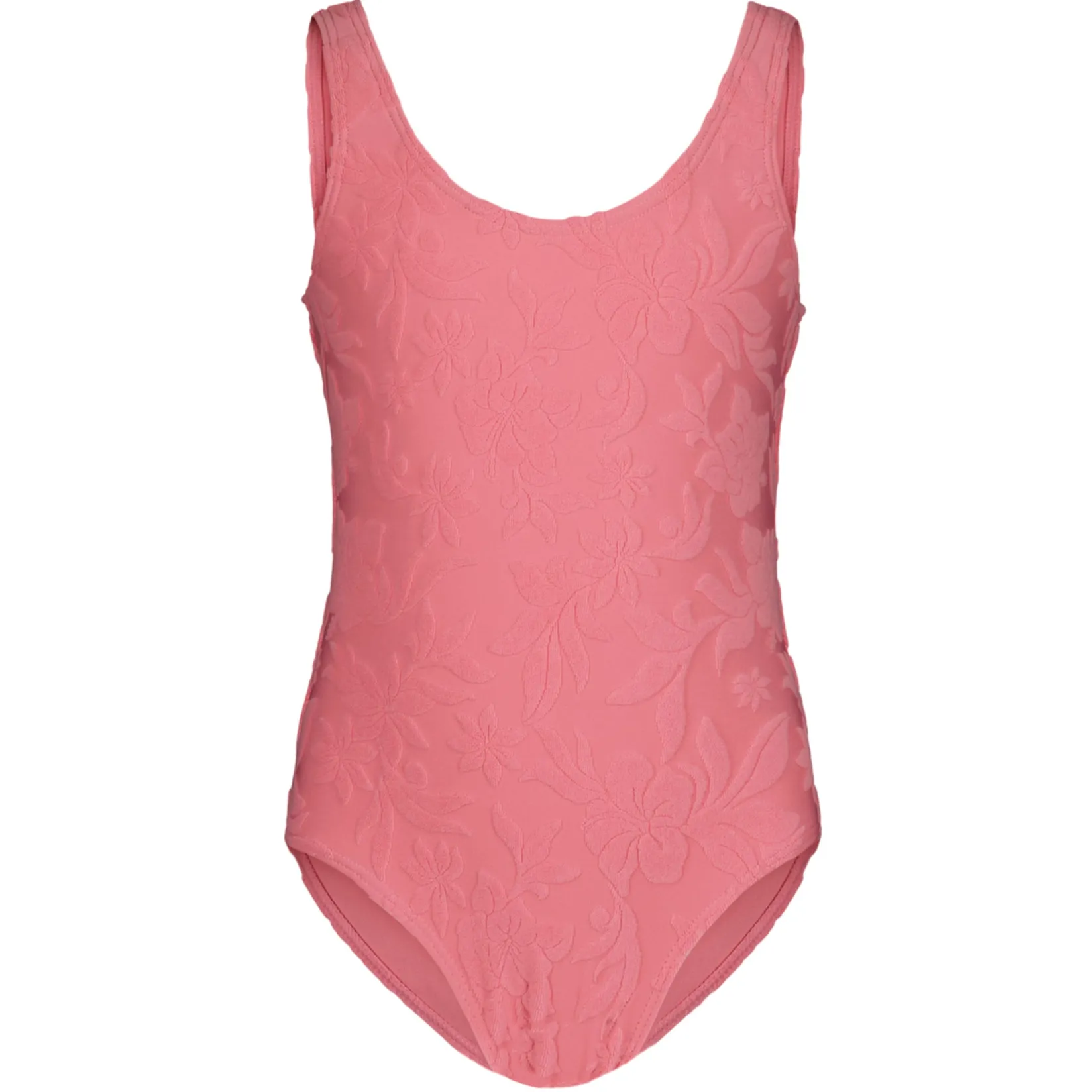 Say Aloha to your new favorite swim suit! The Hula Loop Bikini One Piece in bright Plumeria pink is full of tropical fun, with a pretty floral jacquard pattern that’s made for sunshine, splashing, and sandy adventures. The soft, stretchy UPF50+ fabric feels great all day long—perfect for swimming, playing, or just chilling by the pool. The high scoop-neck top with wide straps gives support and comfort, so you can move, jump, and dive with confidence.