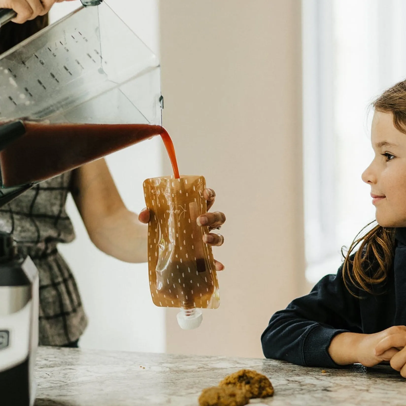 -Turn the pouch inside out and open the zipper. Fill with your favorite recipe (Smoothie, Applesauce, Yogurt, Baby Puree, Soup).