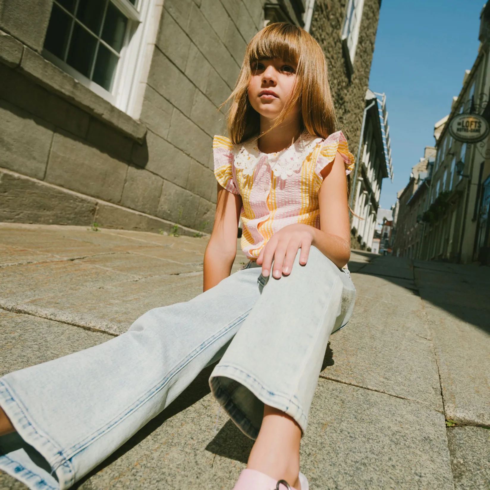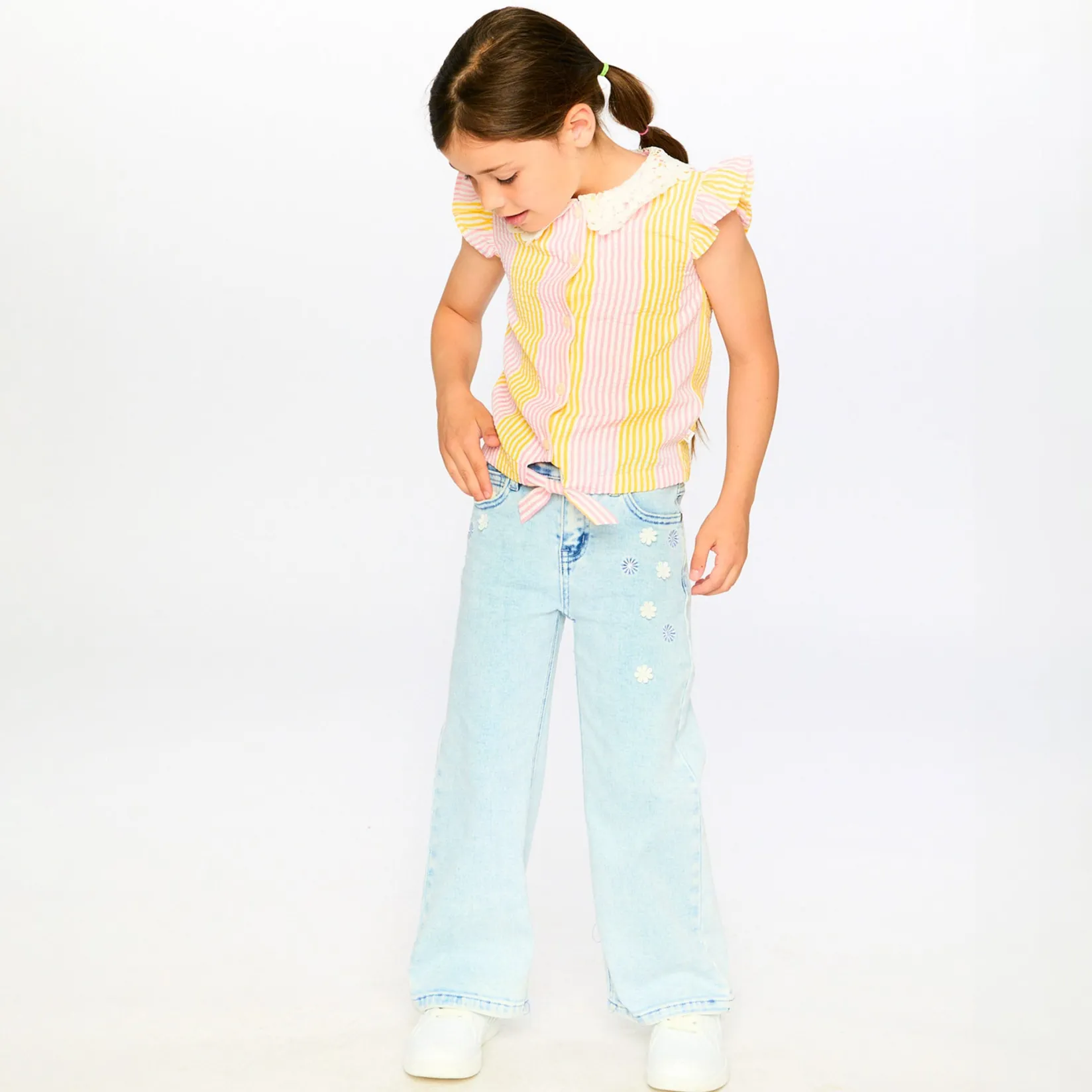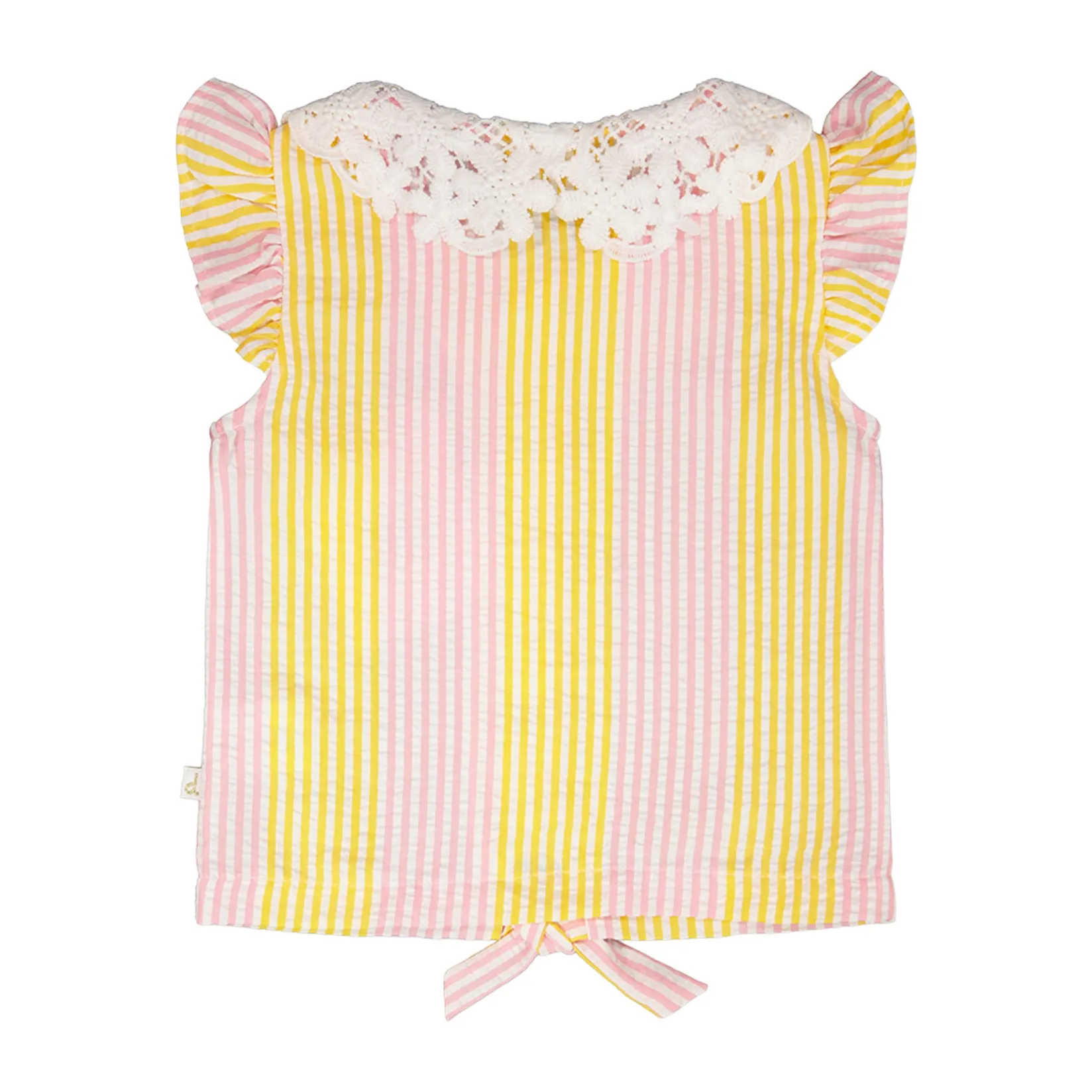 Fresh and stylish, our sleeveless shirt with pink and yellow stripes and a crochet collar is perfect for sunny days. This blouse features flutter details at the shoulders, a delicate crochet Peter Pan collar, a full front button placket, and a charming front tie knot for a playful twist. Part of the “Explosion of Daisies” collection, it pairs beautifully with skirts, shorts, or pants for an effortlessly chic summer look.