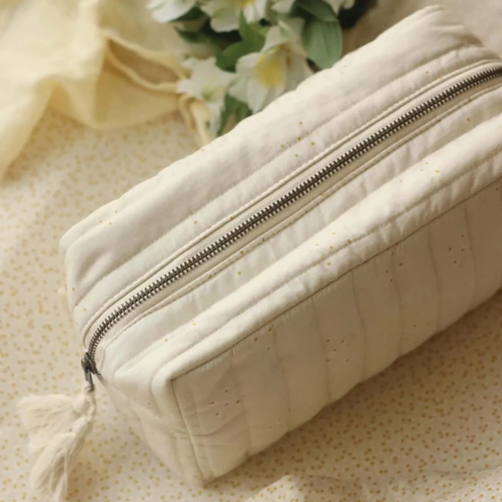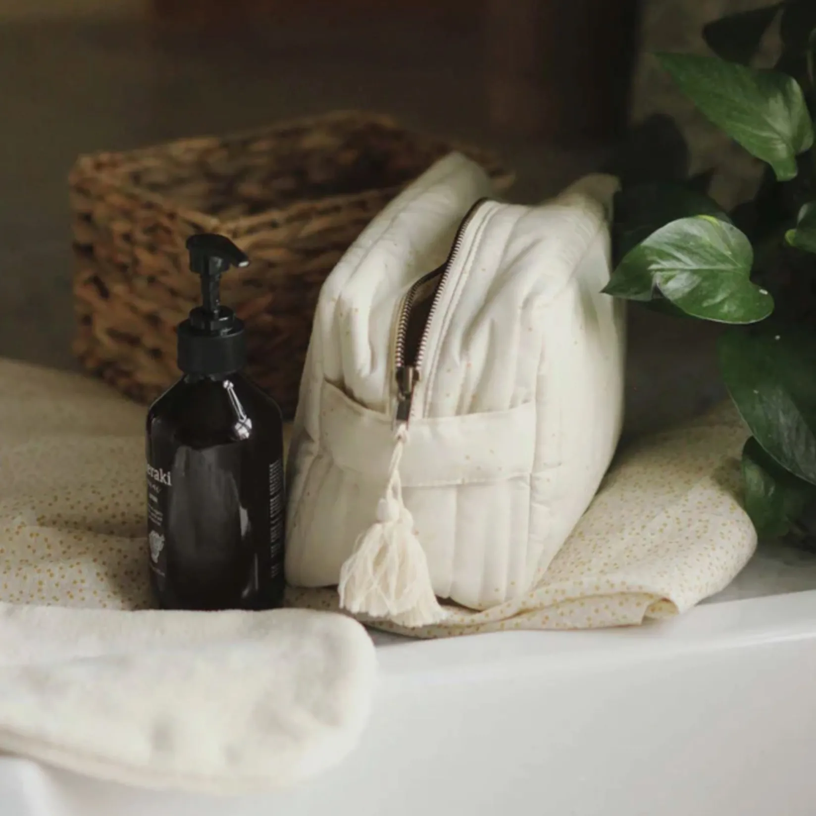 The organic cotton quilted wash bag comes in our unique prints with a stylish tassel. A beautifully designed, practical pouch for parent or baby to store your toiletries, make up, and more or nappies and creams. It also has a handy elasticised pocket inside. The product that is for parent and baby and has an infinite number of uses.