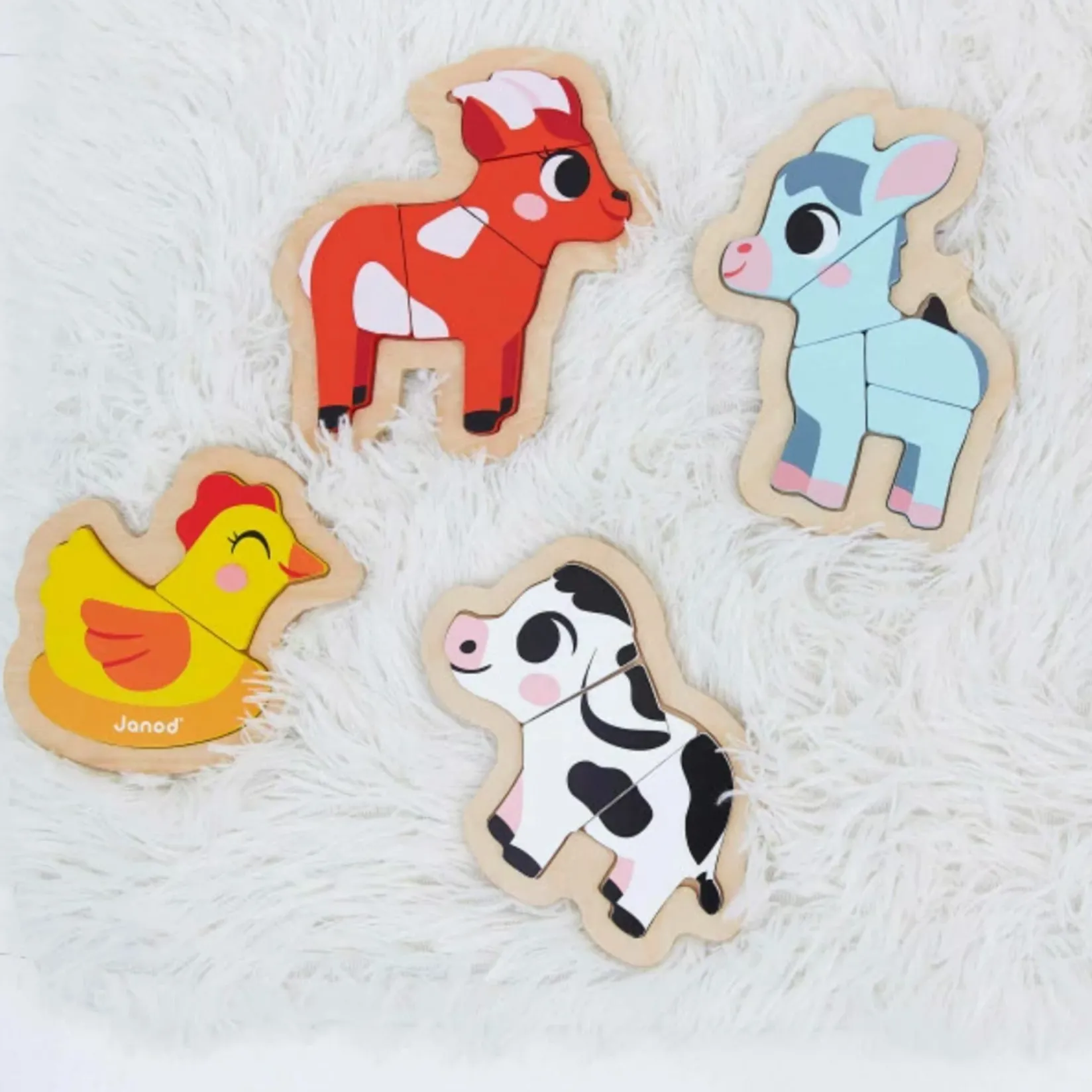 From the age of 18 months, children can begin to learn about the joys of puzzles! Perfect for developing fine motor skills and coordination! This set of 4 early-learning progressive puzzles will delight little farm animal lovers! With this wooden puzzle set – presented in a pretty gift box – which contains 4 puzzles, ranging from 2 to 5 pieces, children can have fun whilst progressing at their own pace. Featuring little ones’ favourite animals: a 2-piece hen, a 3-piece cow, a 4-piece goat and a 5-piece donkey. The pieces – which must be put back in the right order on the wooden stand – have been designed for babies to grasp onto them well. This early-learning game will be a true pleasure to play! This toy can also be used to prompt children to learn their first numbers. The puzzles are made from FSC® wood.