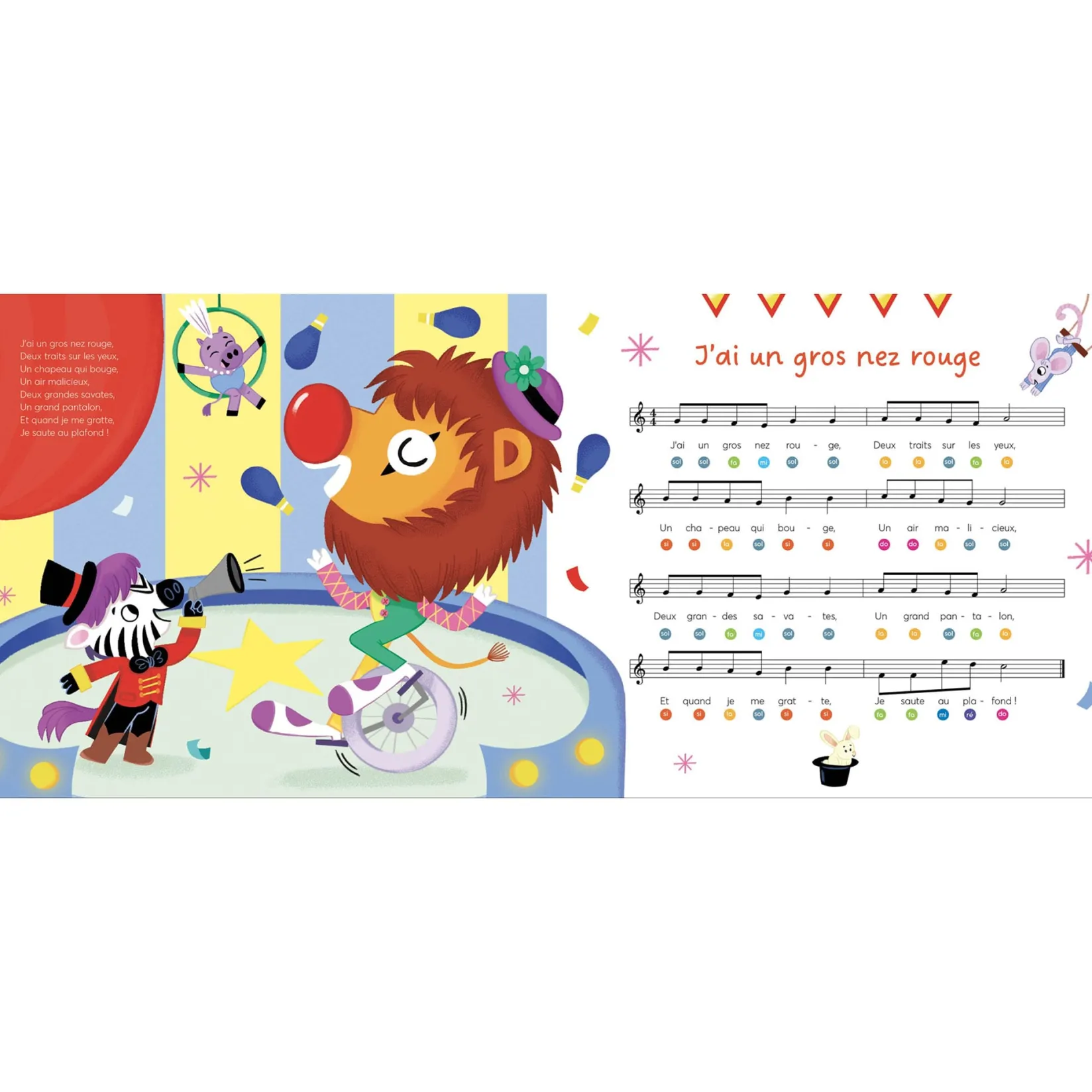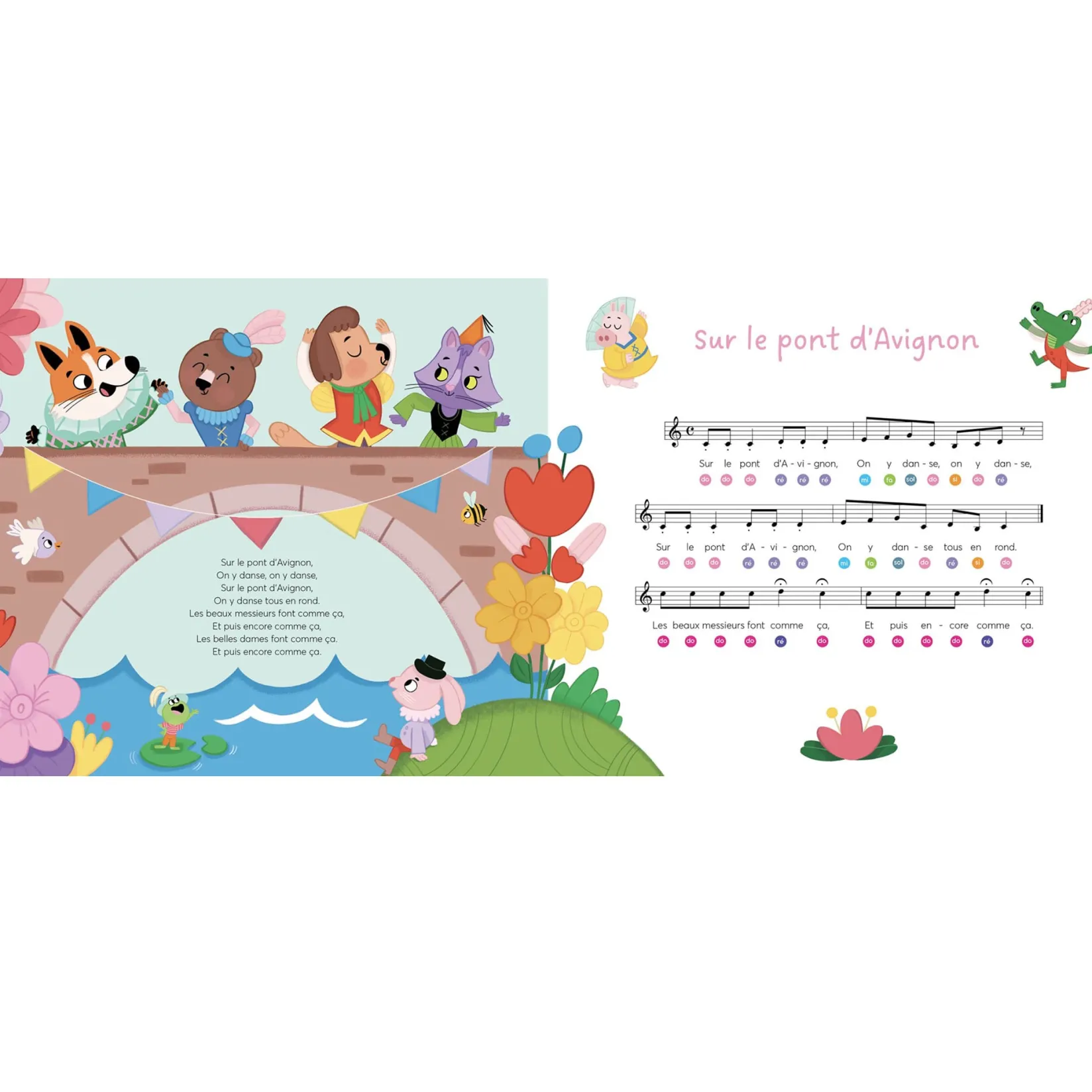 Munie d’un piano intégré, la collection propose des comptines adaptées aux tout-petits qui souhaitent découvrir le piano. Sur la page de gauche, le texte de la comptine accompagné d’une illustration ; sur la page de droite, la portée musicale transpose les notes grâce à un code couleurs très simple.
