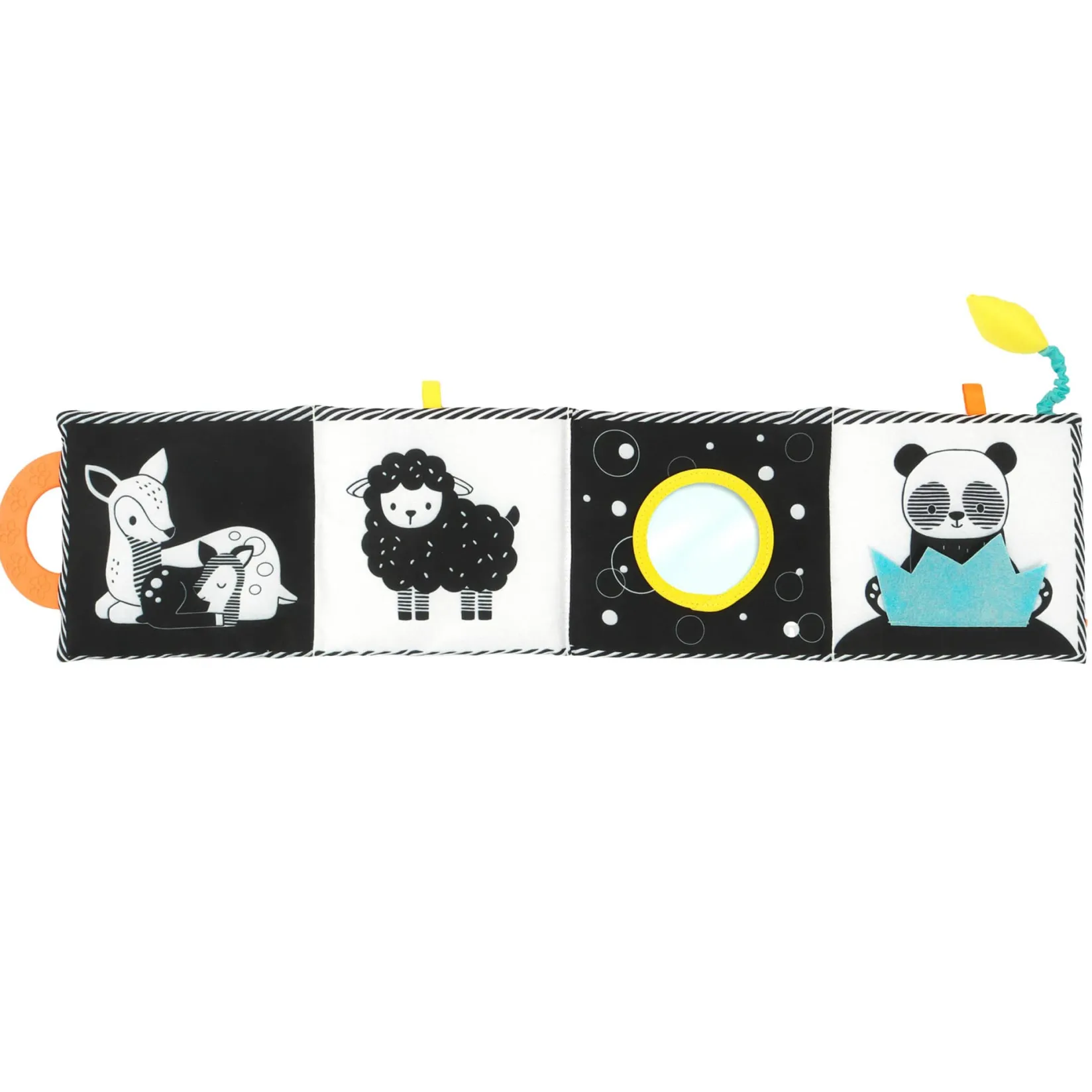Un livre en tissu à contrastes pour un éveil visuel dès le plus jeune âge.En format accordéon, ce livre en tissu propose différents éléments de manipulation pour un éveil tactile et moteur : un anneau de dentition, un grelot, des flaps en feutrine, des rubans à attraper et un incontournable : le miroir. Un cadeau de naissance idéal !